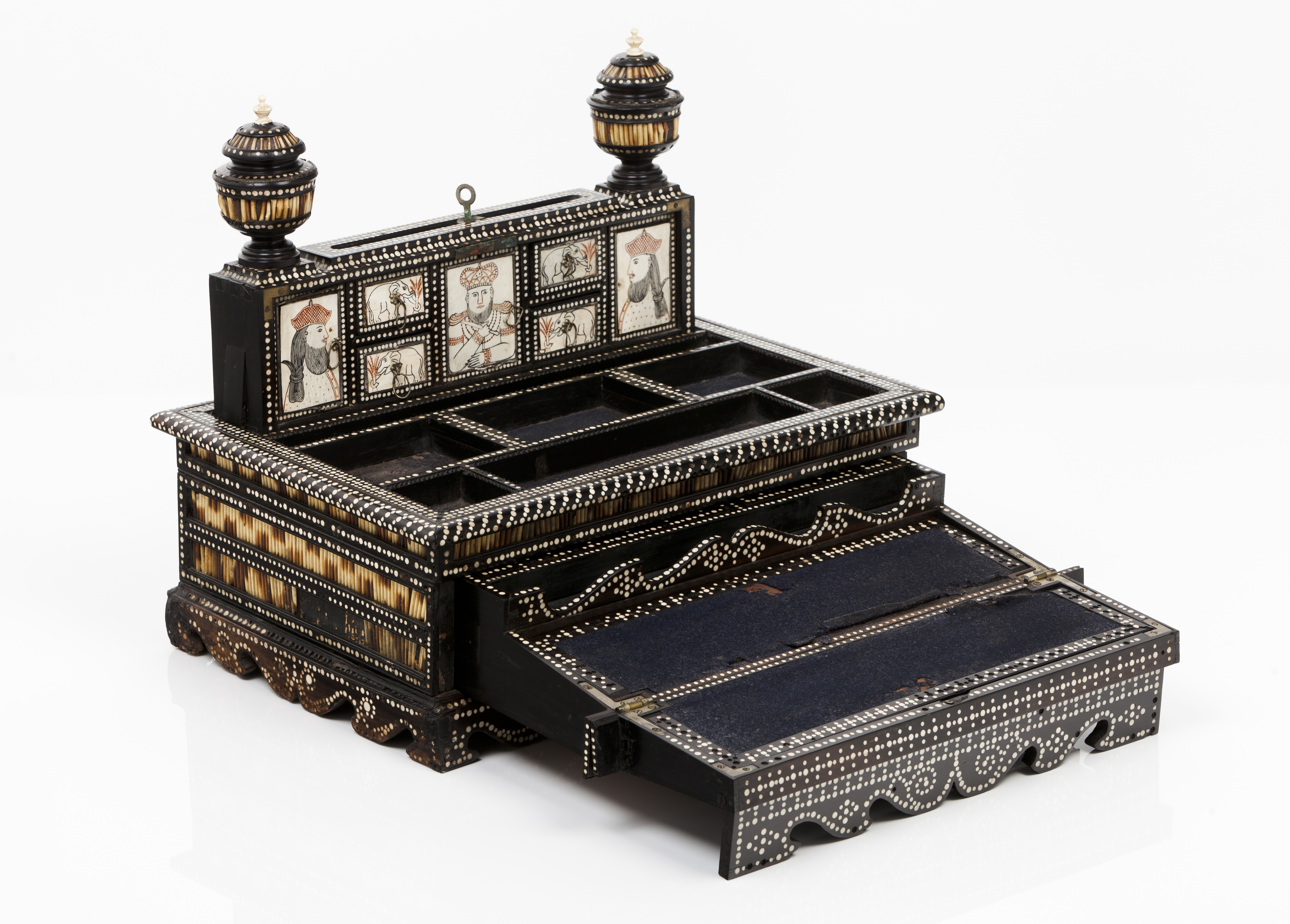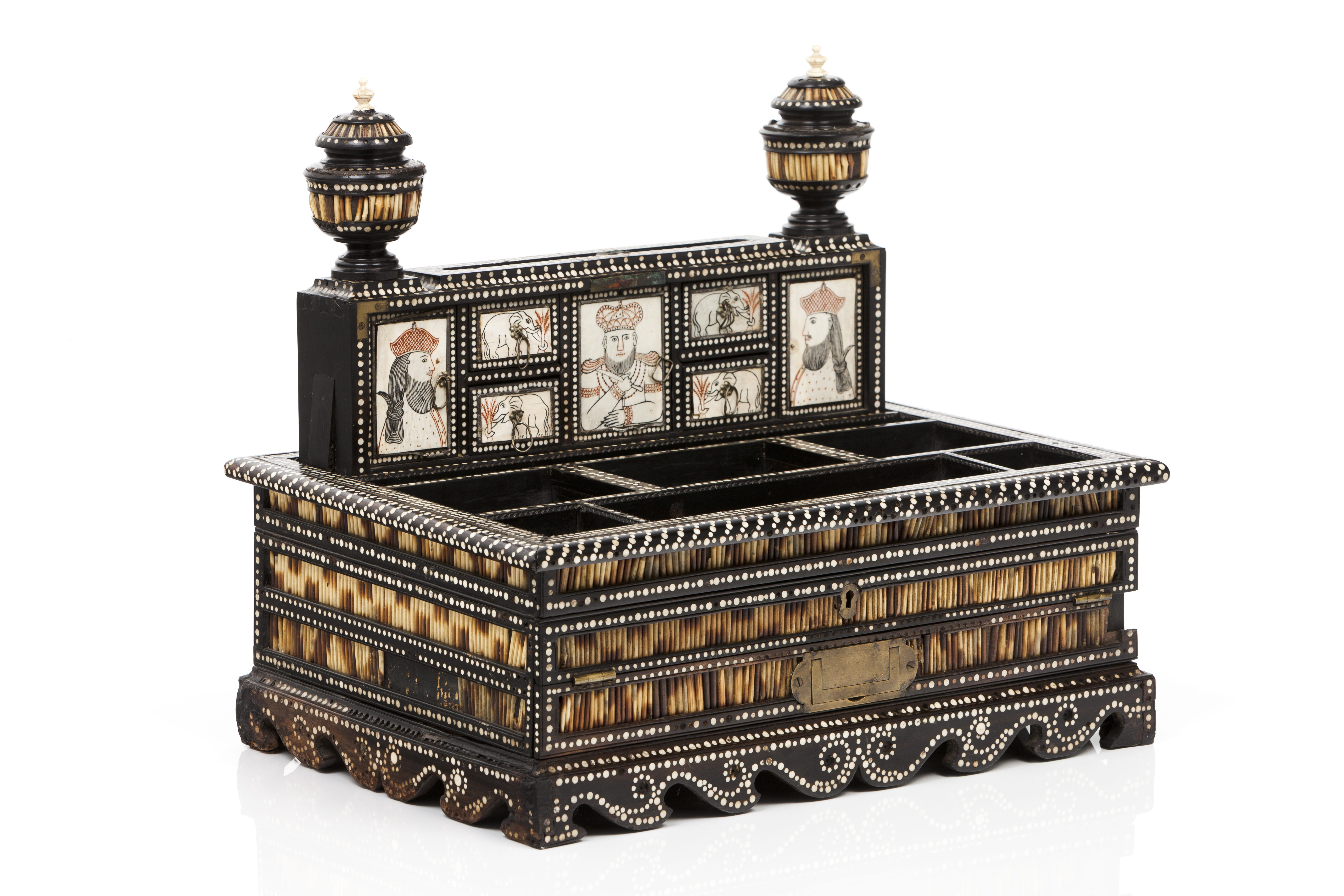 Mechanic upper section, toped by two pinnacles, enclosing seven small compartments decorated in sgrafittoed ivory depicting kings and elephants