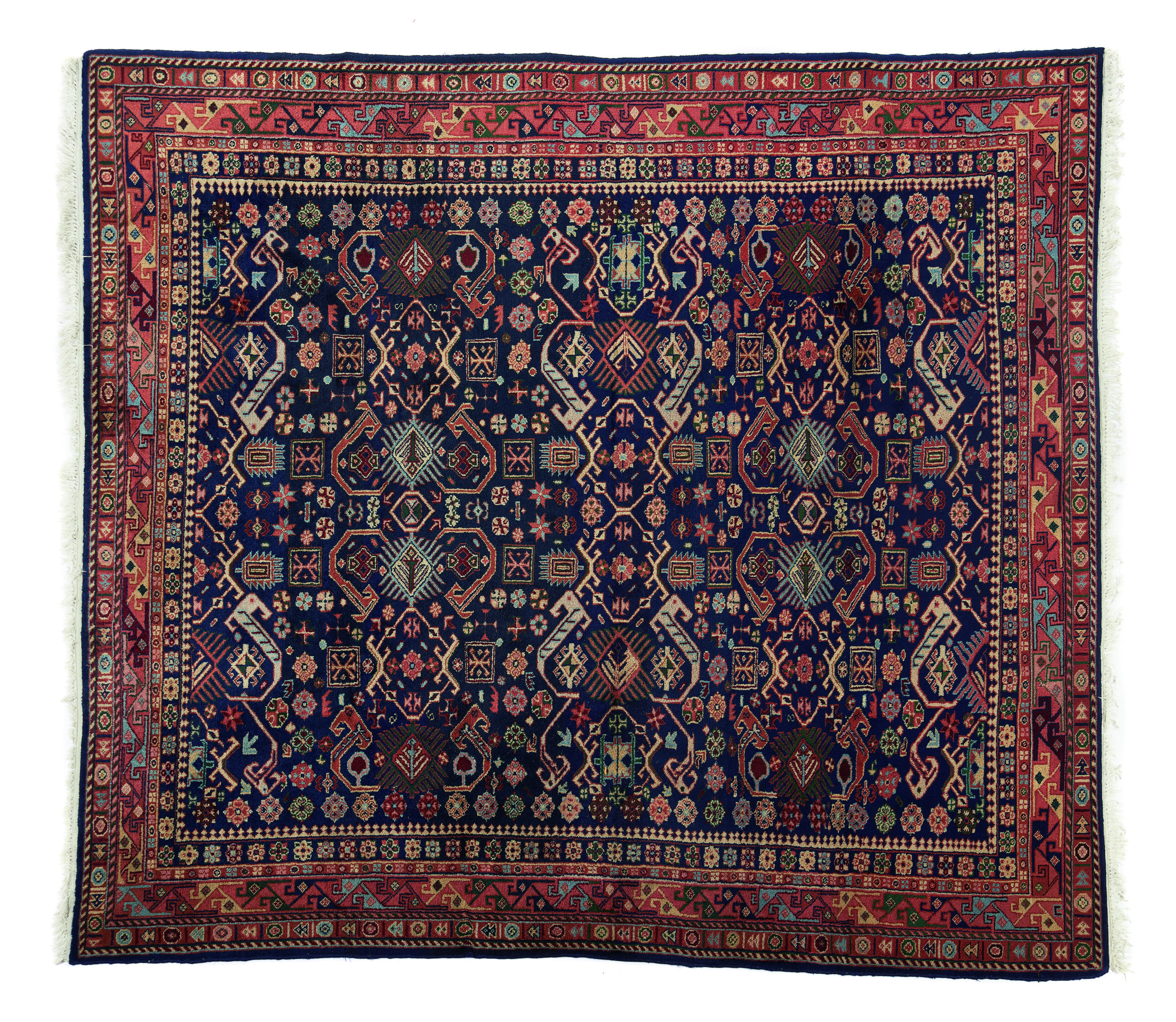 Geometric and floral pattern in bordeaux, blue, beige, orange and green
