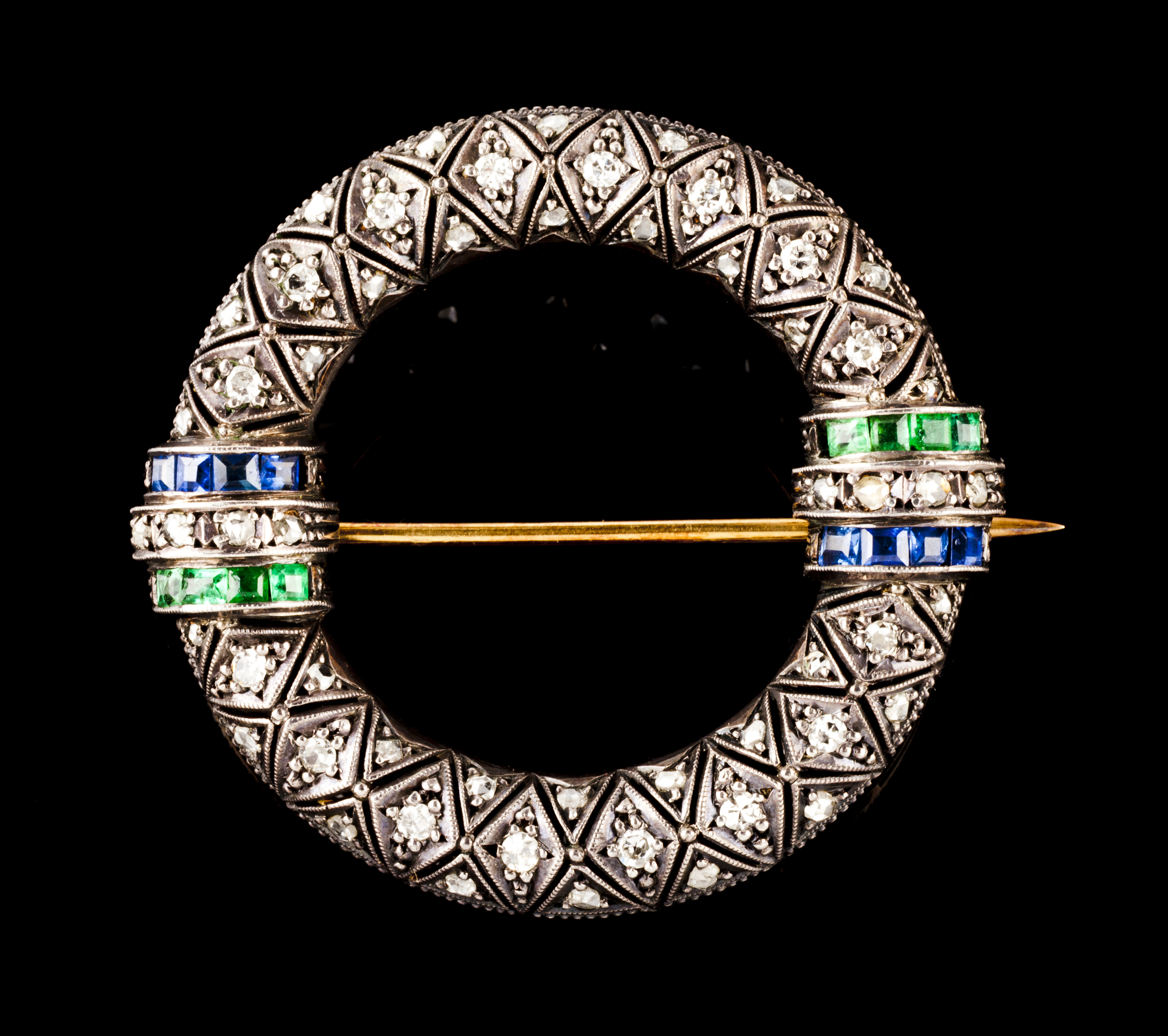 Set with carré sapphires and emeralds and rose and single cut diamonds