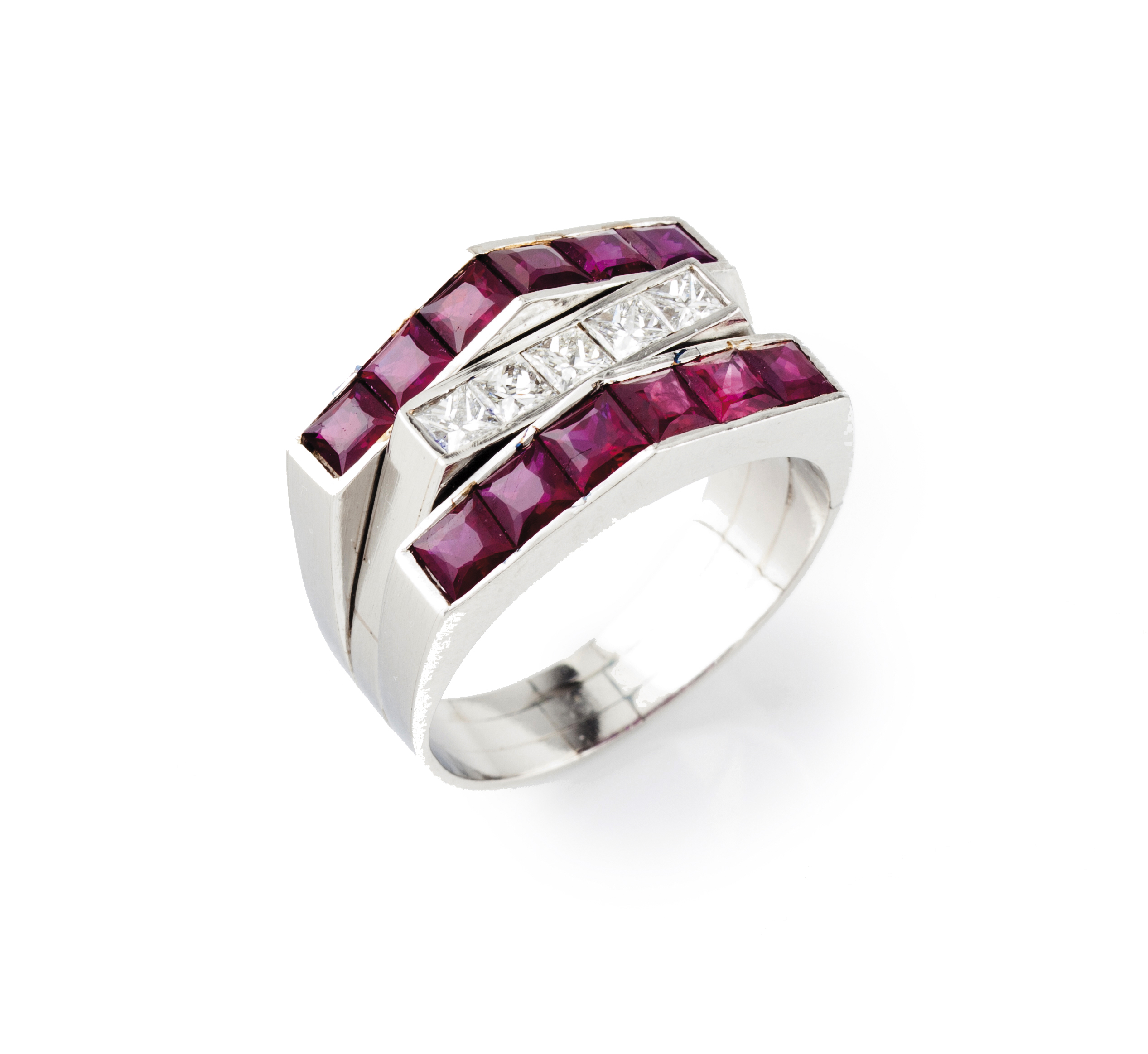 Set with 12 calibrated rubies and 5 princess cut diamonds (ca. 0.60ct)