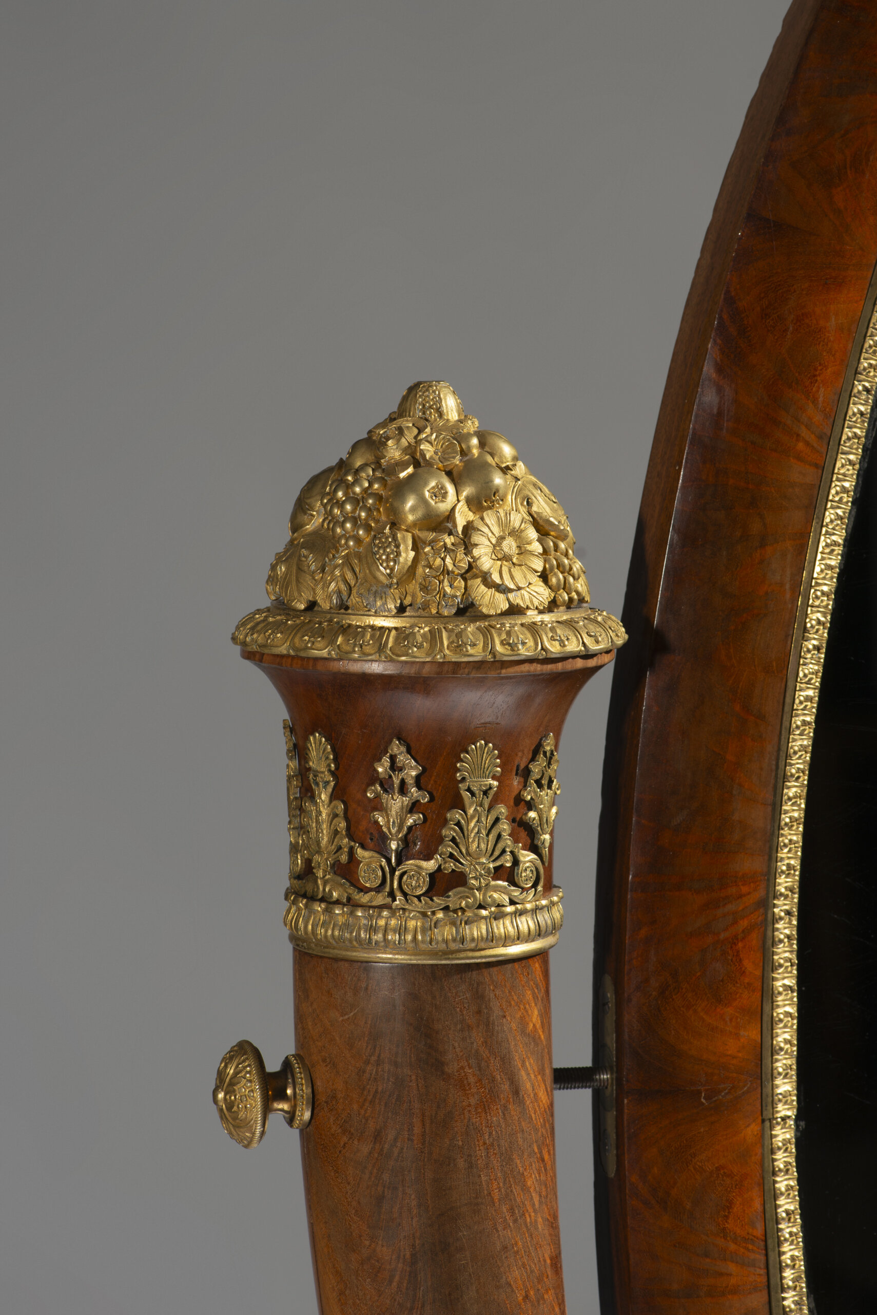 Adjustable oval mirror frame supported by a pair of cornucopiae, the shafts with helical twist veneered in burr thuya and maple, united at the centre by an ormolu bow-tie clasp, terminating in acanthus leaves and surmounted by ormolu finials modelled as baskets of fruit and flowers