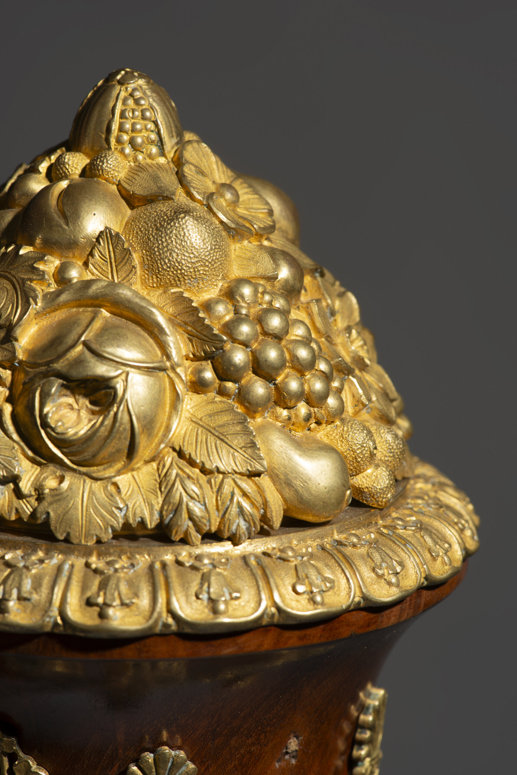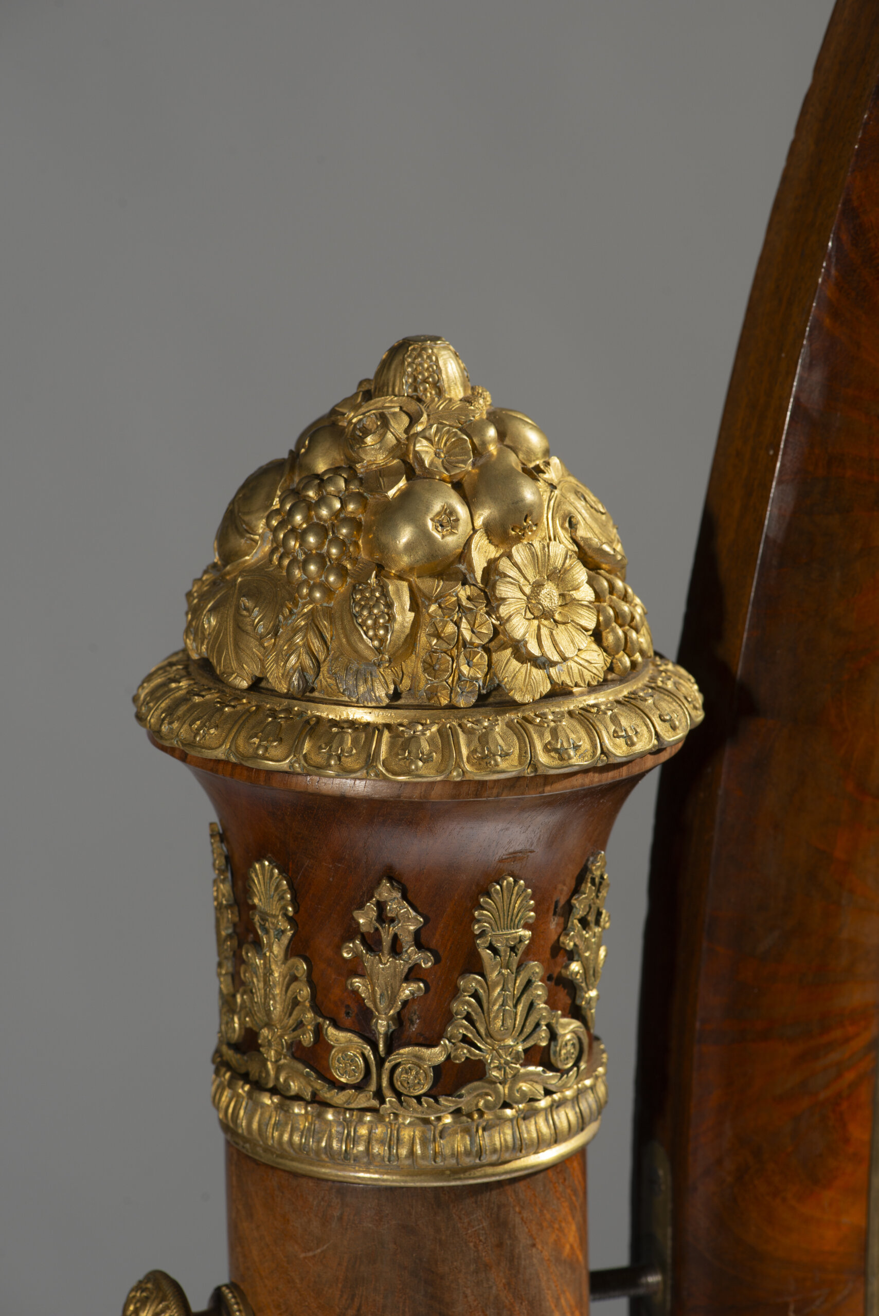Among the most characteristic motifs are cornucopiae, quivers with bundles of arrows, fruit finials, lyres, swans, classical trophies, and scrolls.