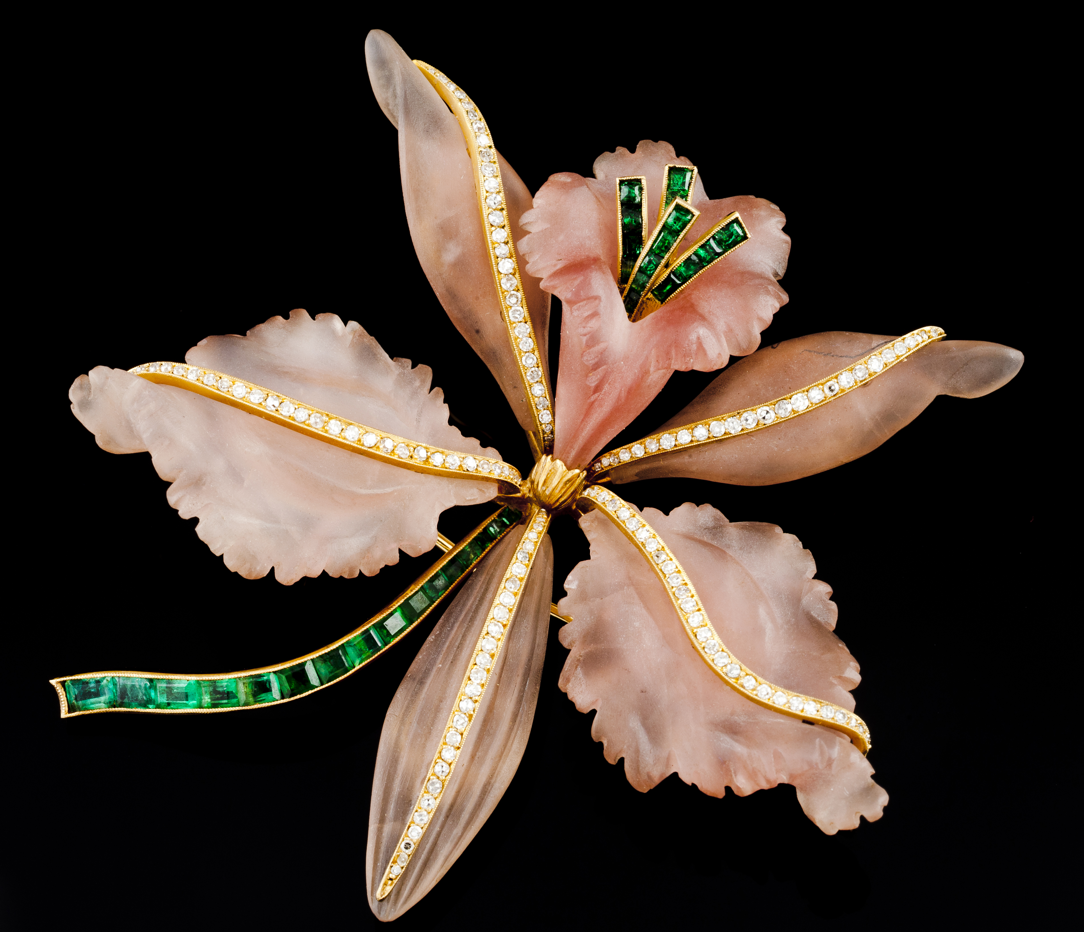 Orchid of carved petals set with small brilliant cut diamonds and calibrated emeralds