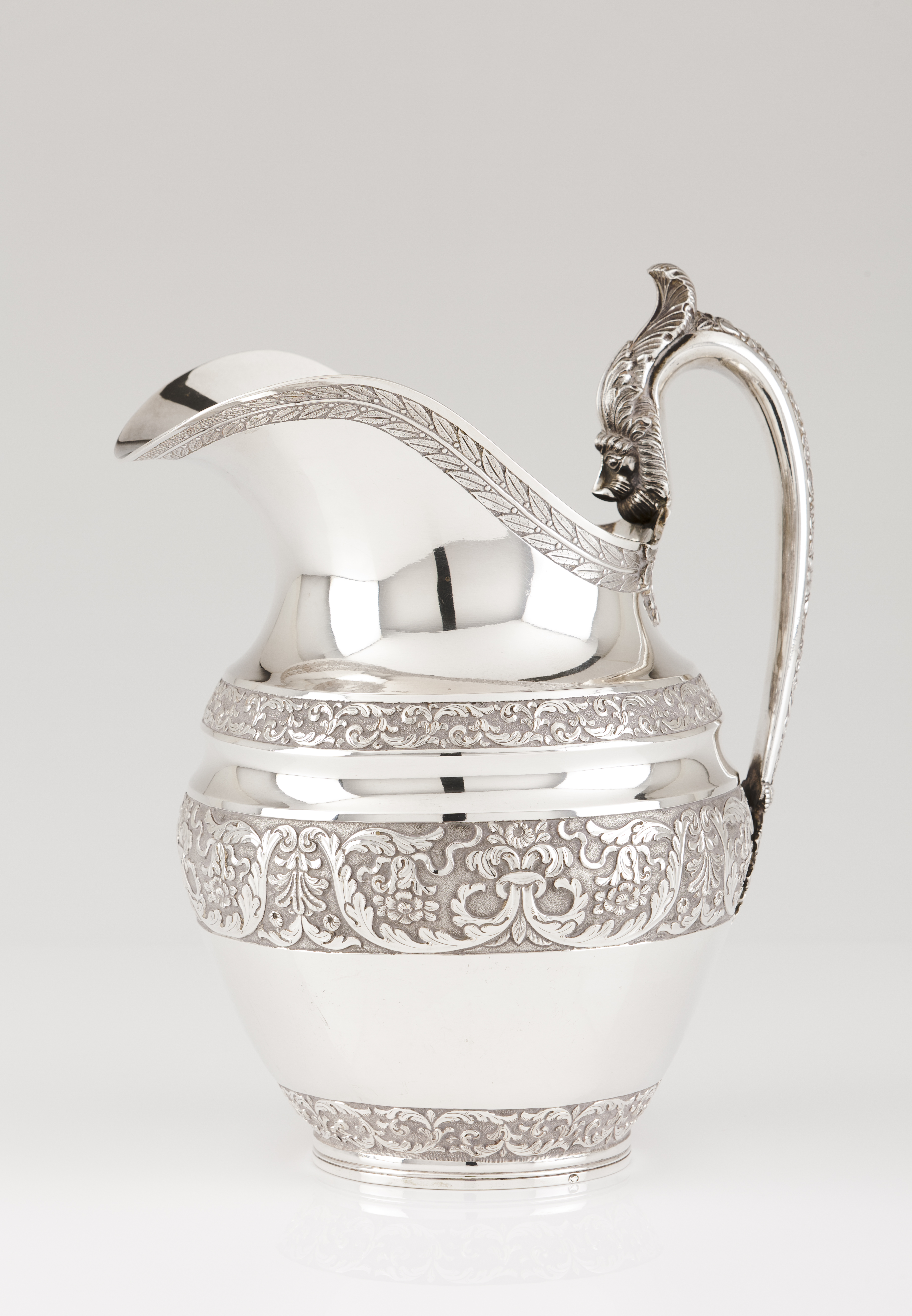Broad reliefs and chiselled bands decoration to body with foliage and small flowers. At the top, close to the rim an engraved frieze simulating laurel wreath
