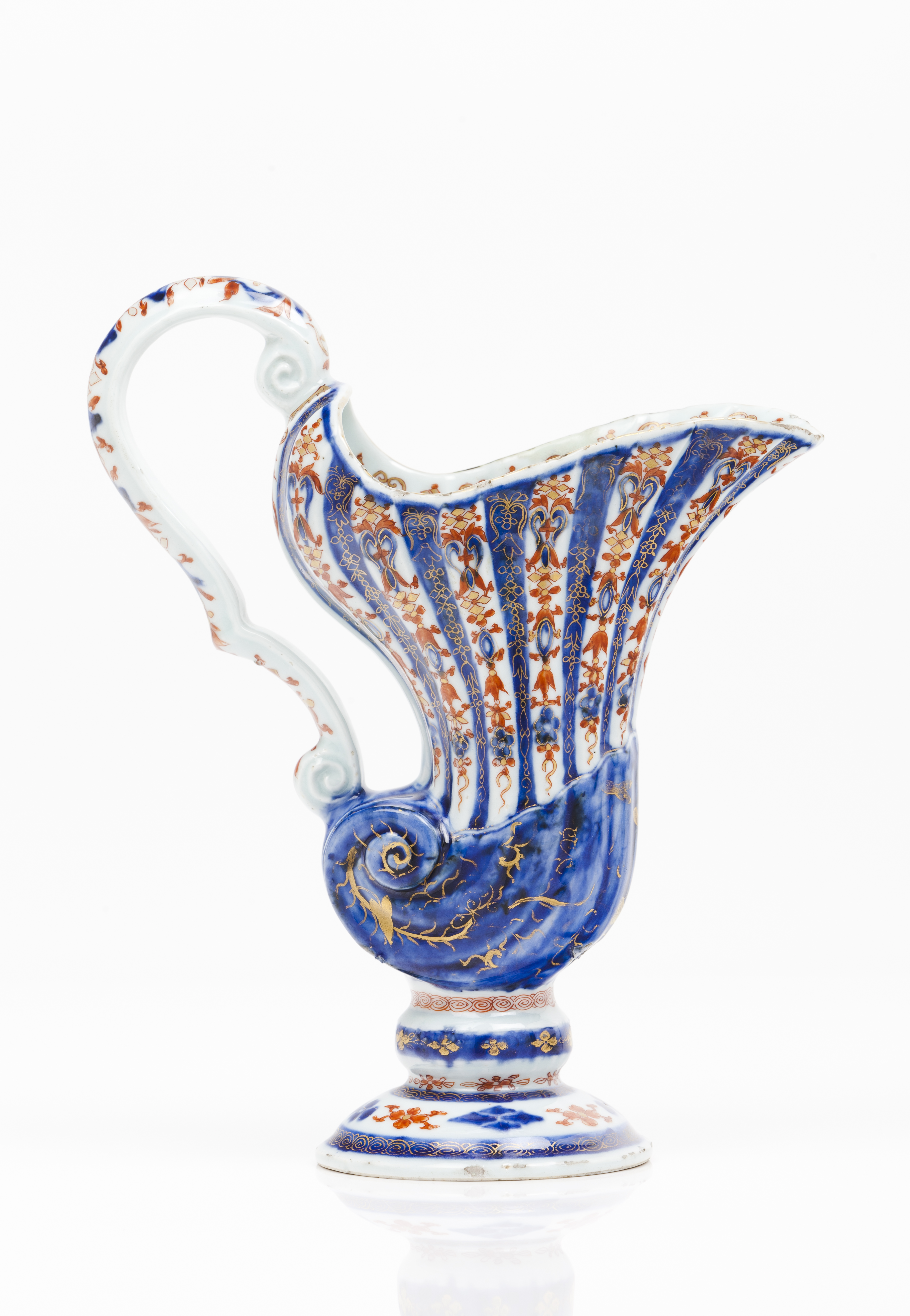 Nautilus shaped ewer of fluted sides, resting on segmented foot and concave base