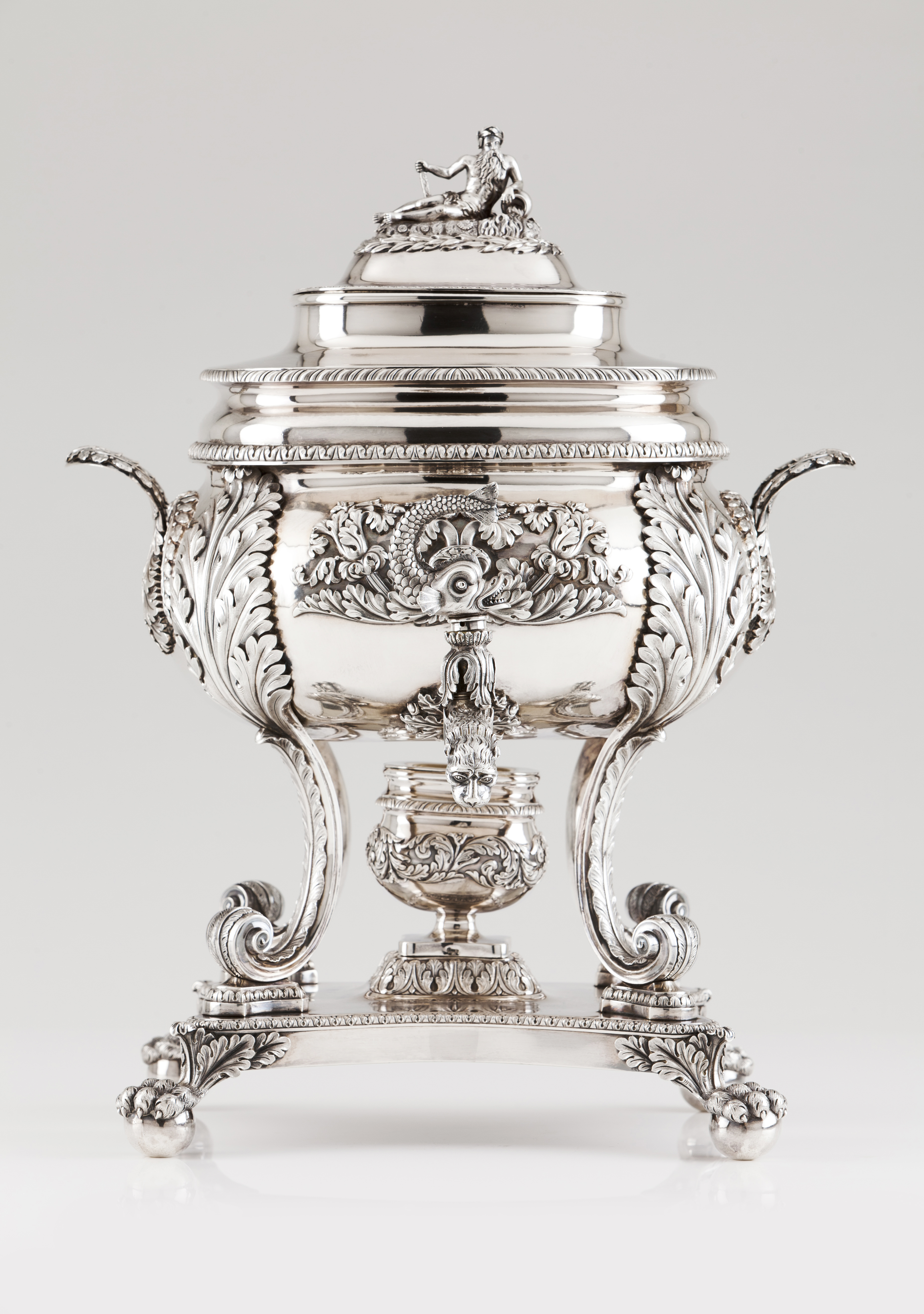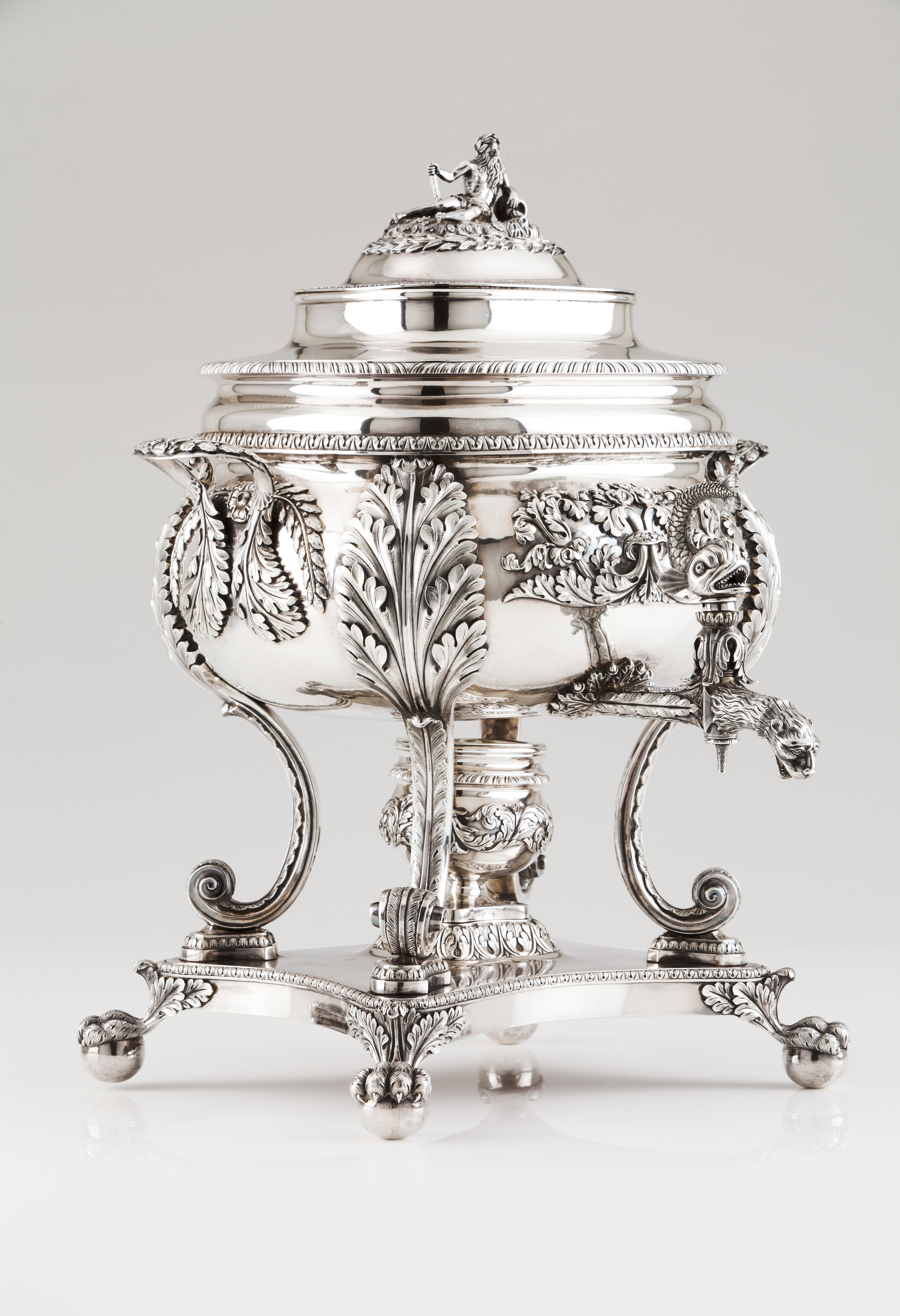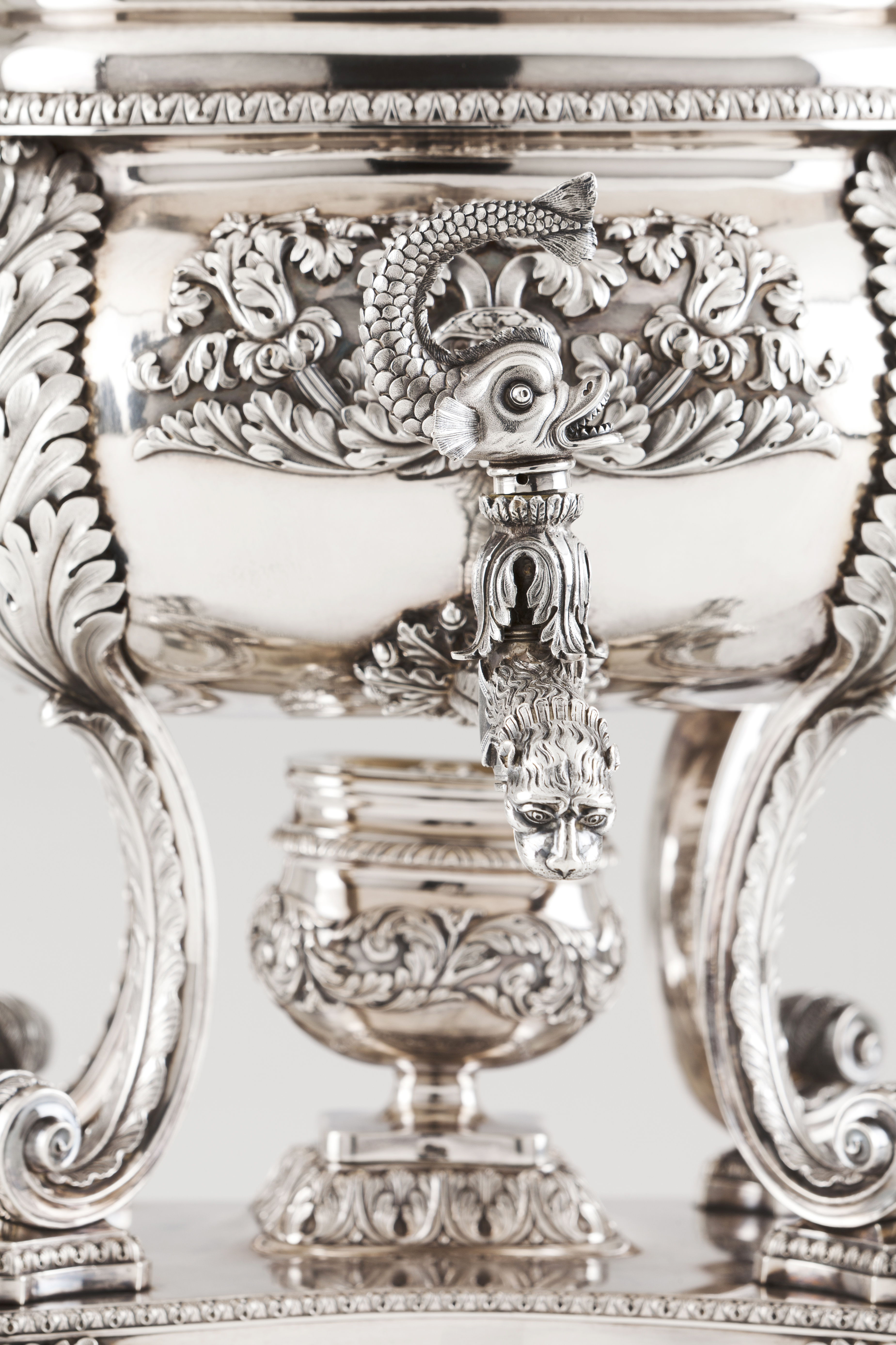 Square shaped profusely decorated with foliage motifs, acanthus leaves and repousse and chiselled applied flower bouquets
