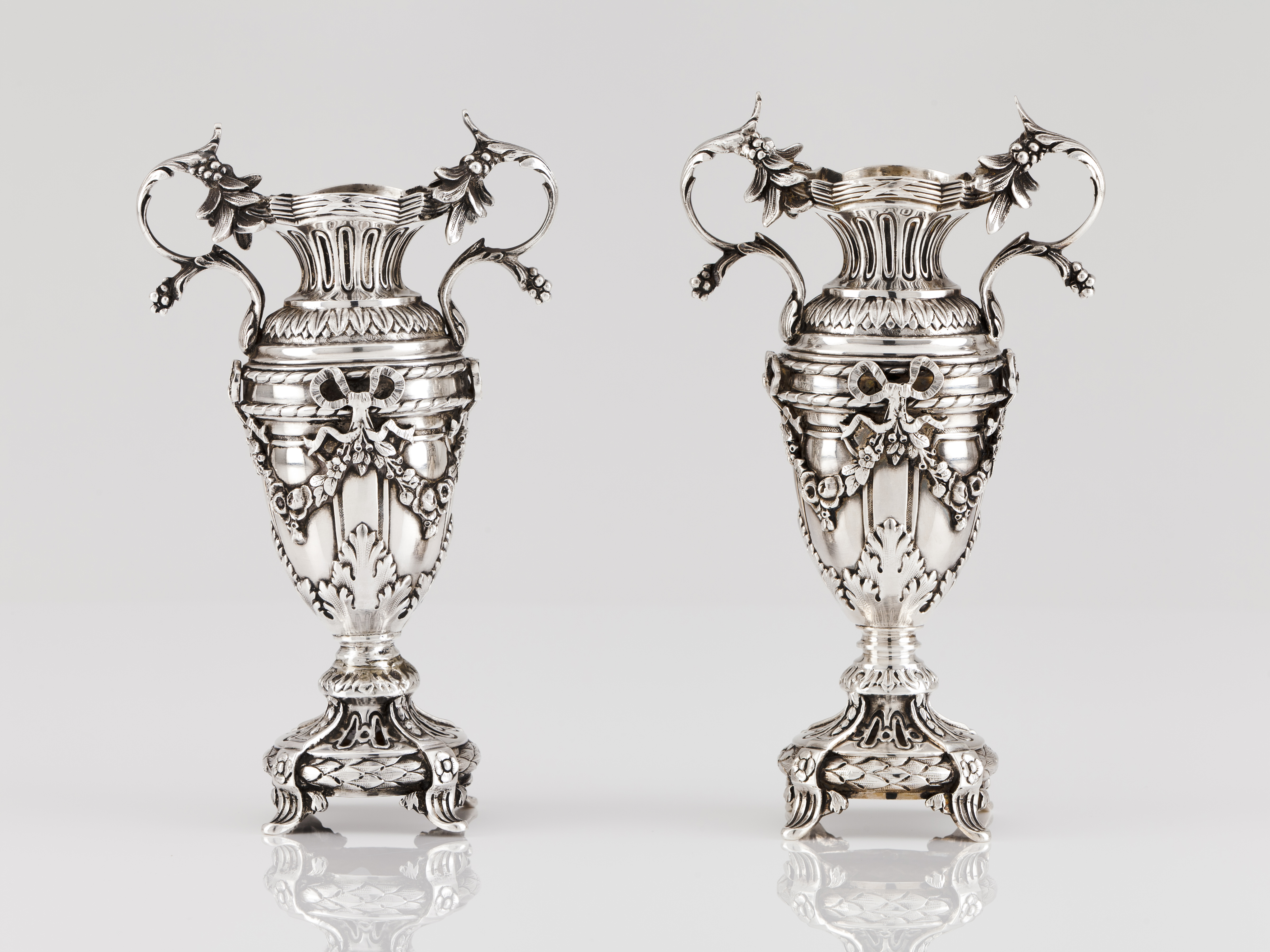 Urn shaped body of profuse reliefs Romantic Era decoration with garlands, bows and ribbons, palm leaves and foliage