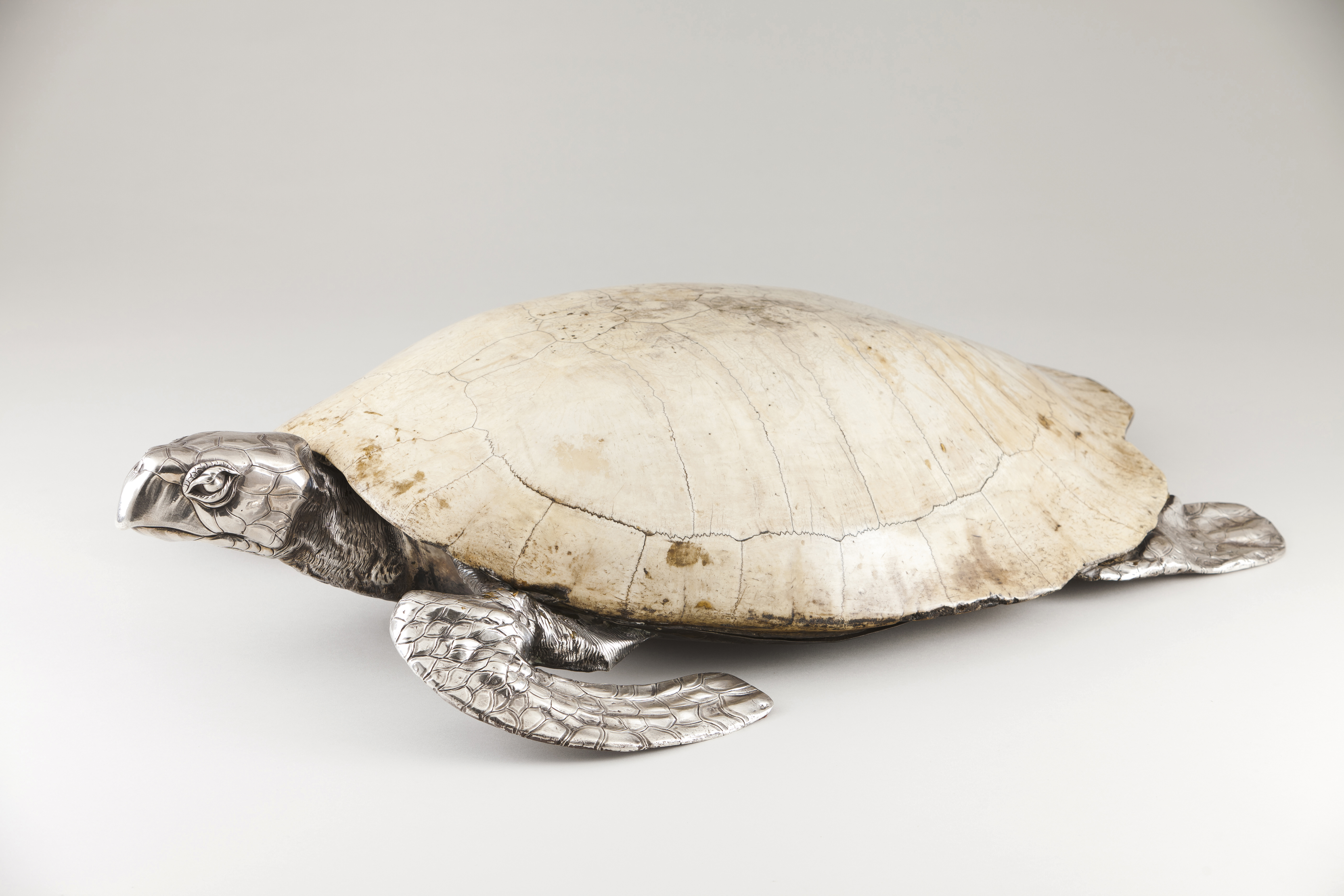 Sculpted silver body and legs, head and tail under a white Galapagos tortoise shell