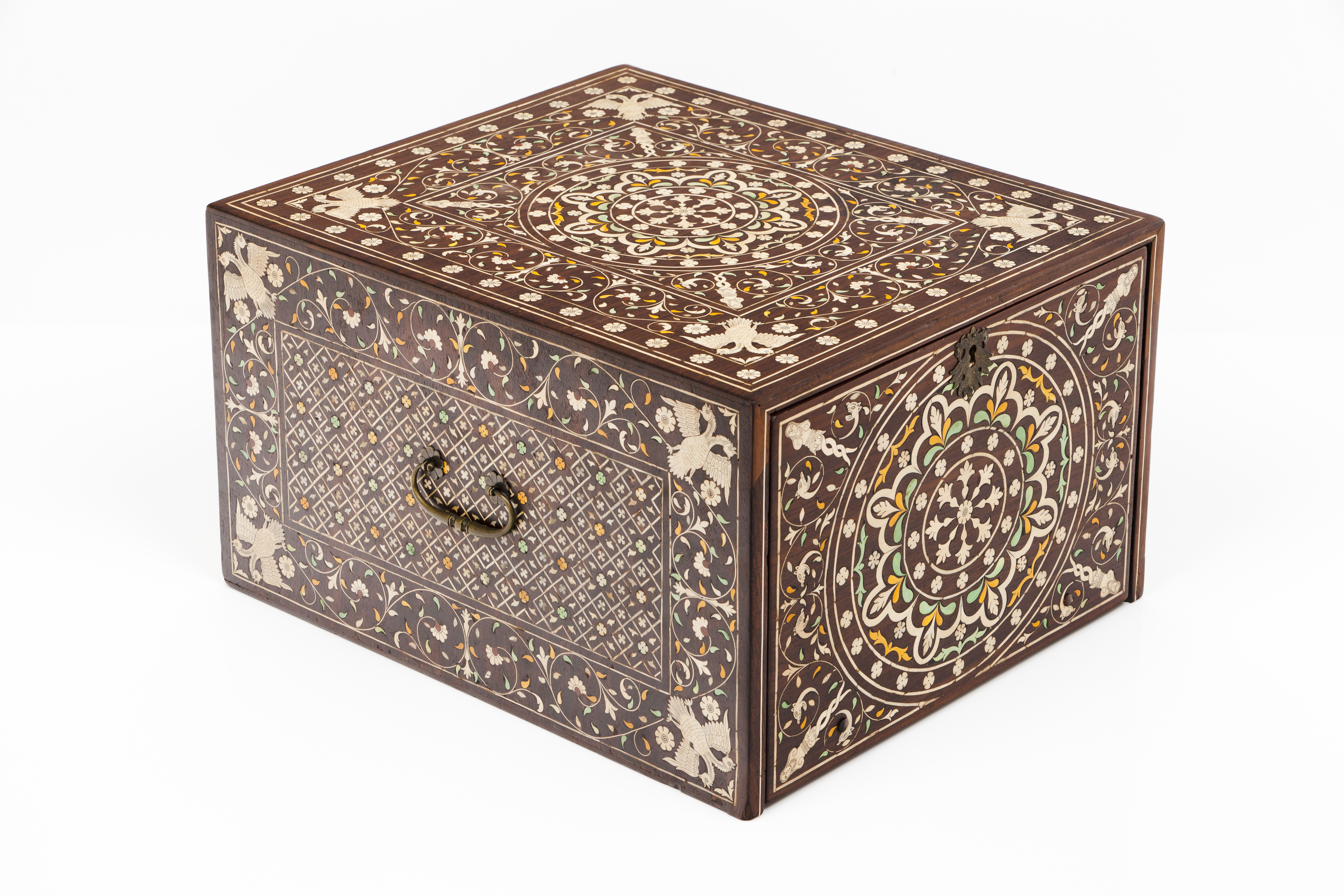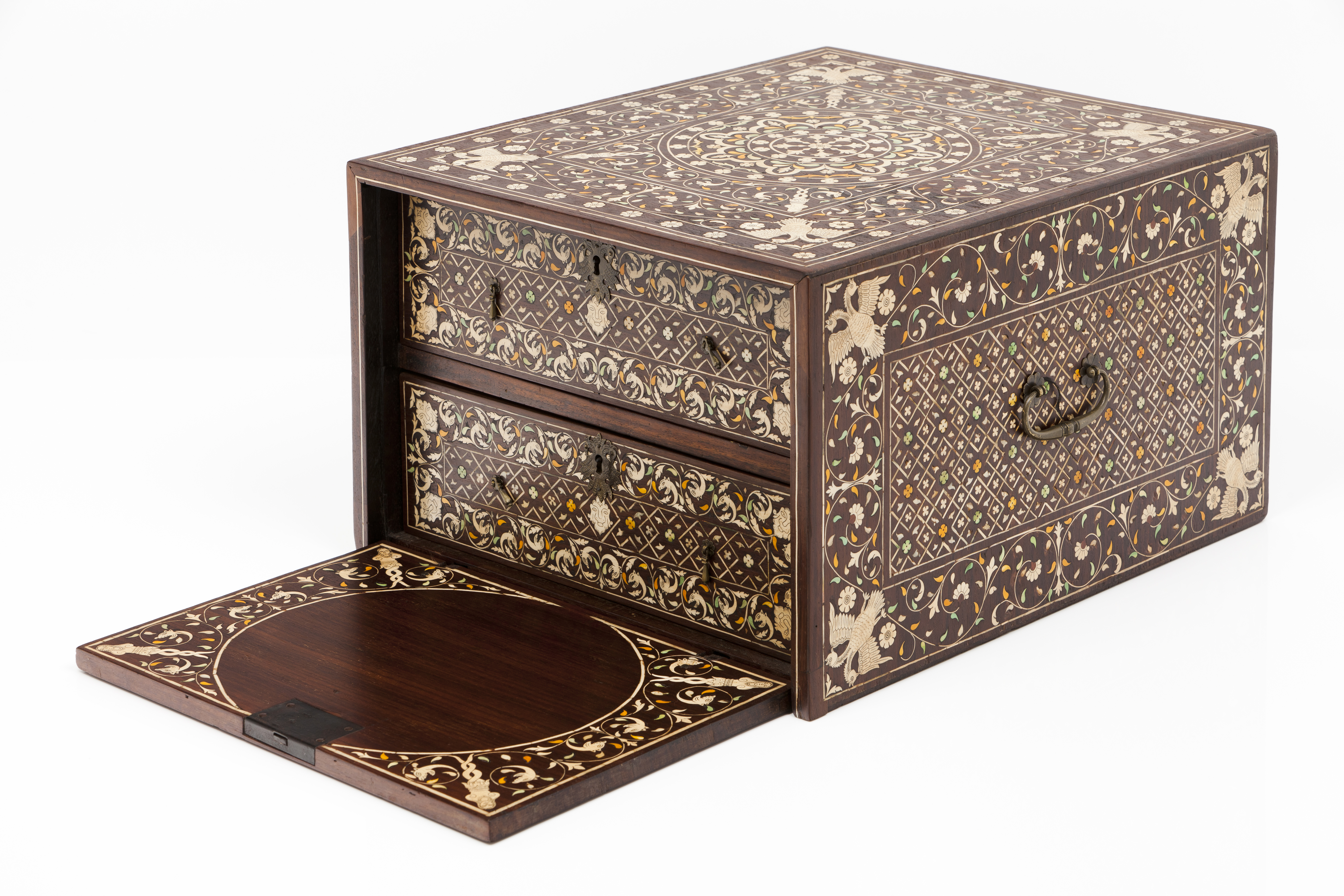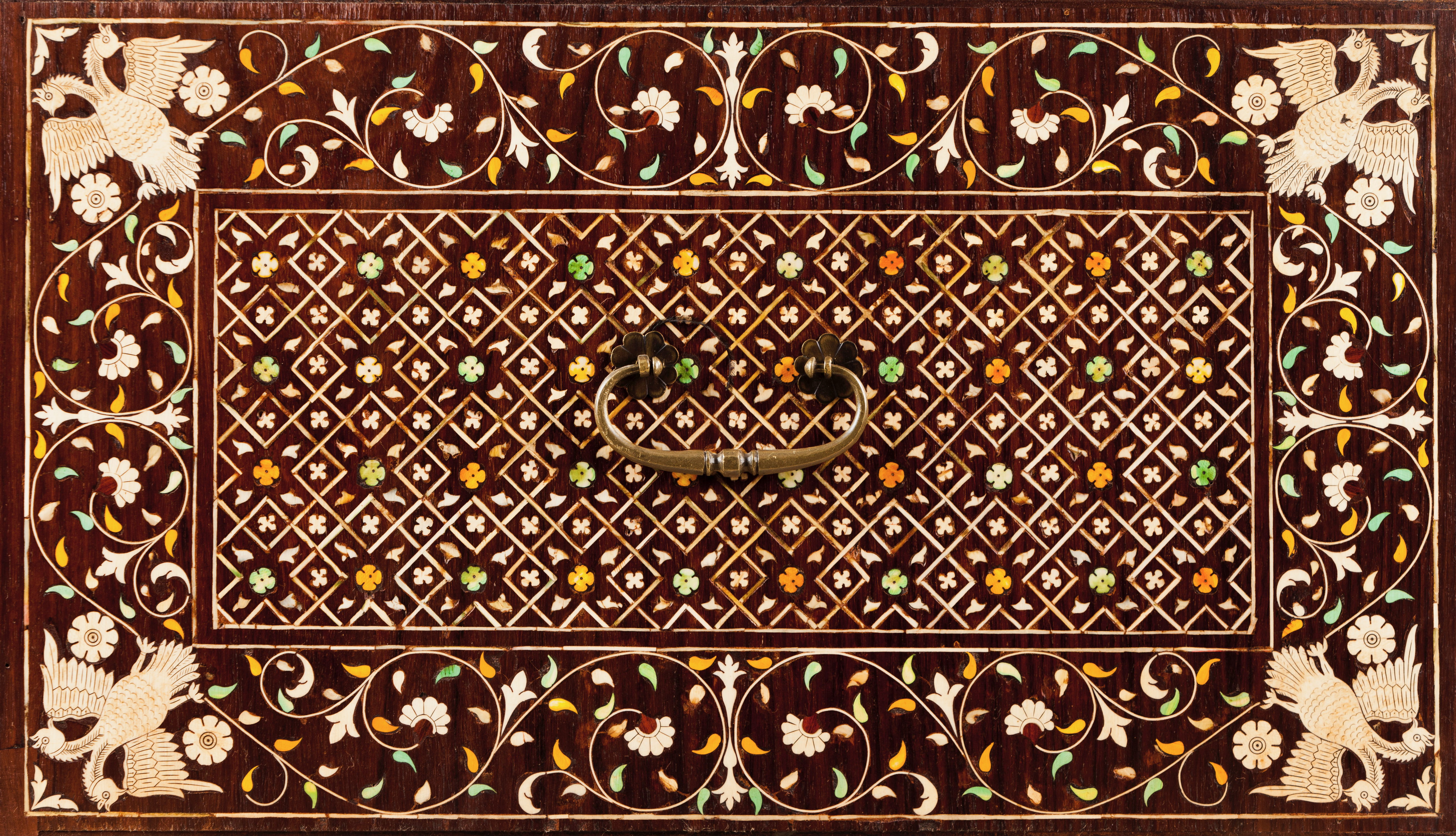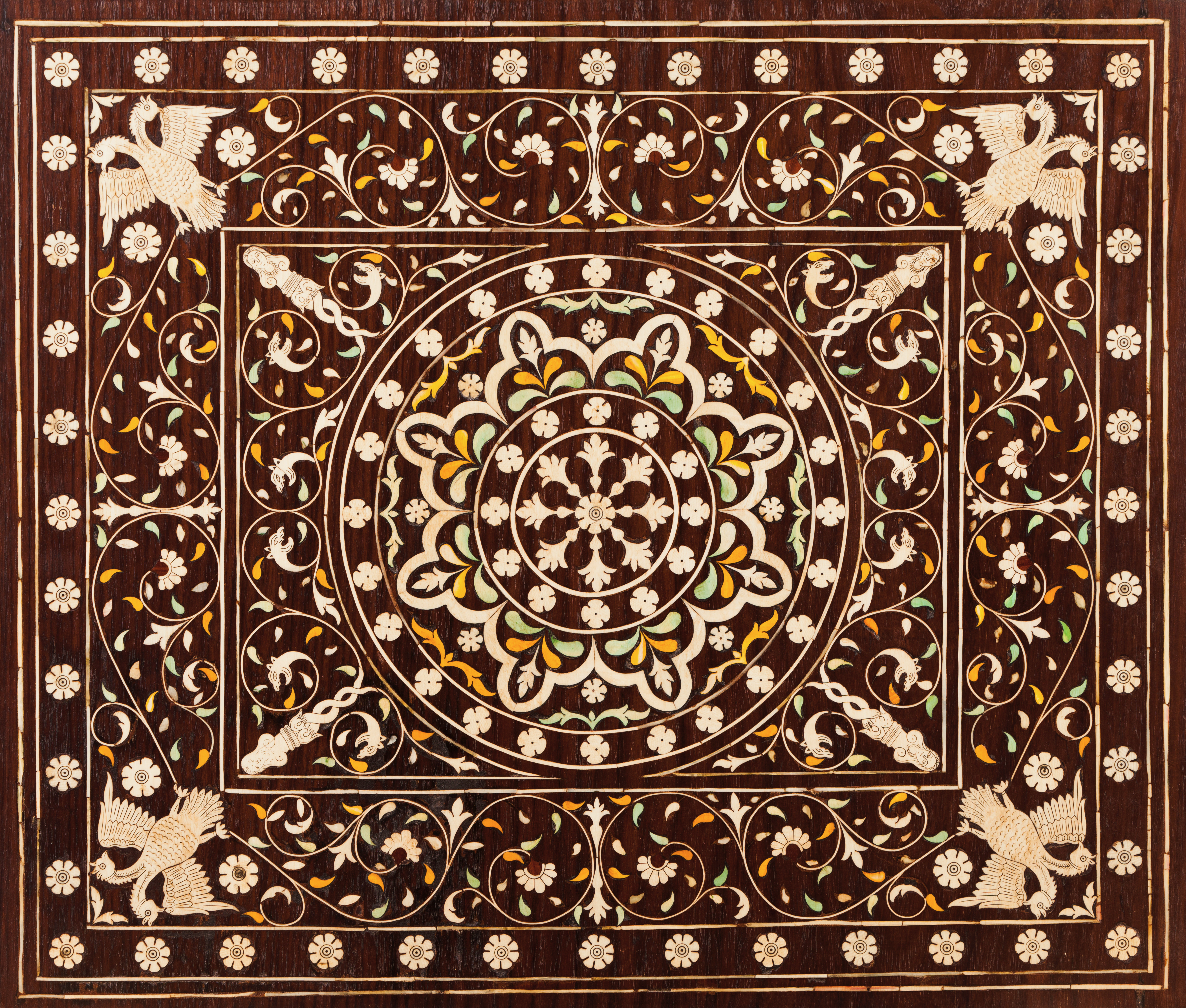 Teak of inlaid white and dyed ivory and foliage, classical masks, double-headed eagles and Nagini
