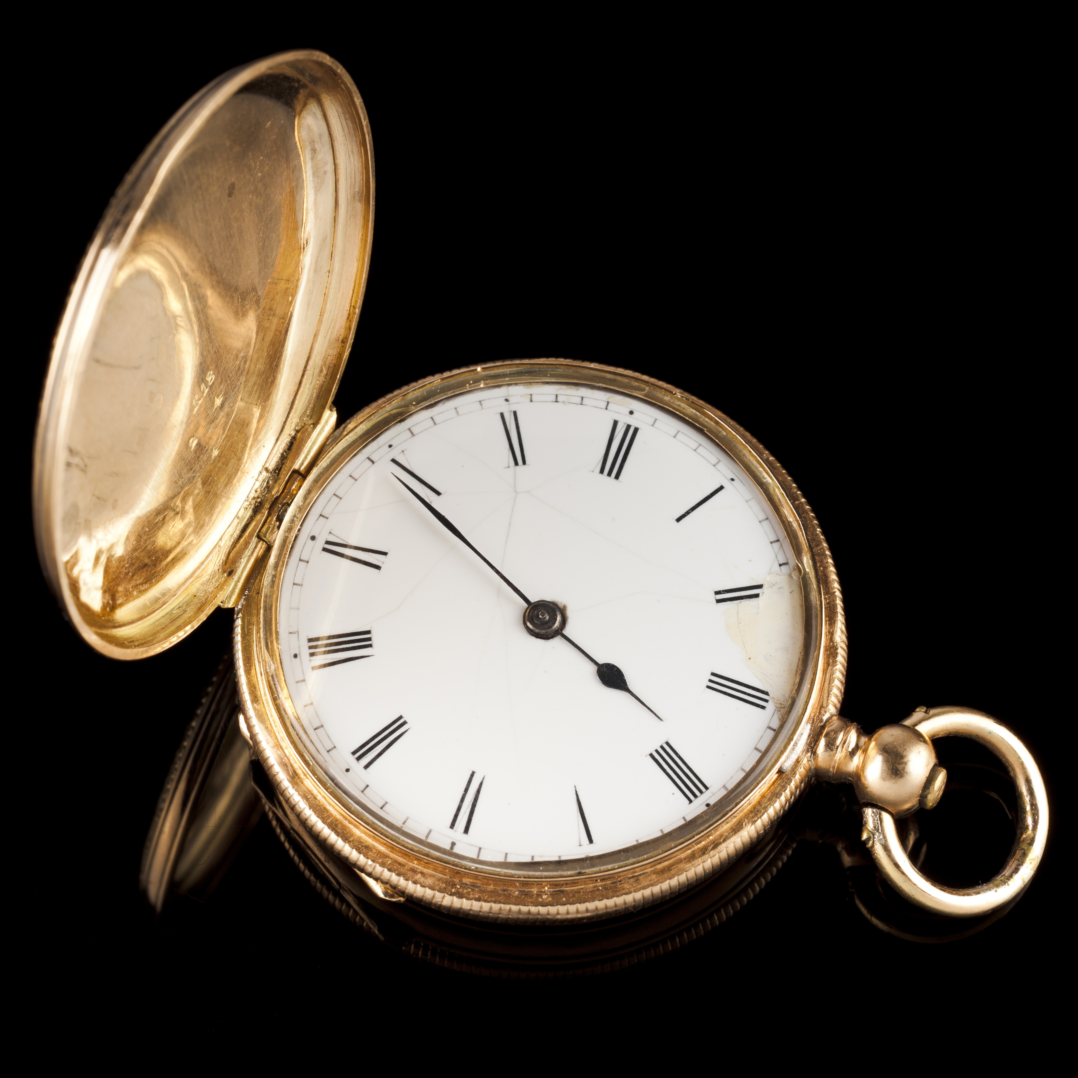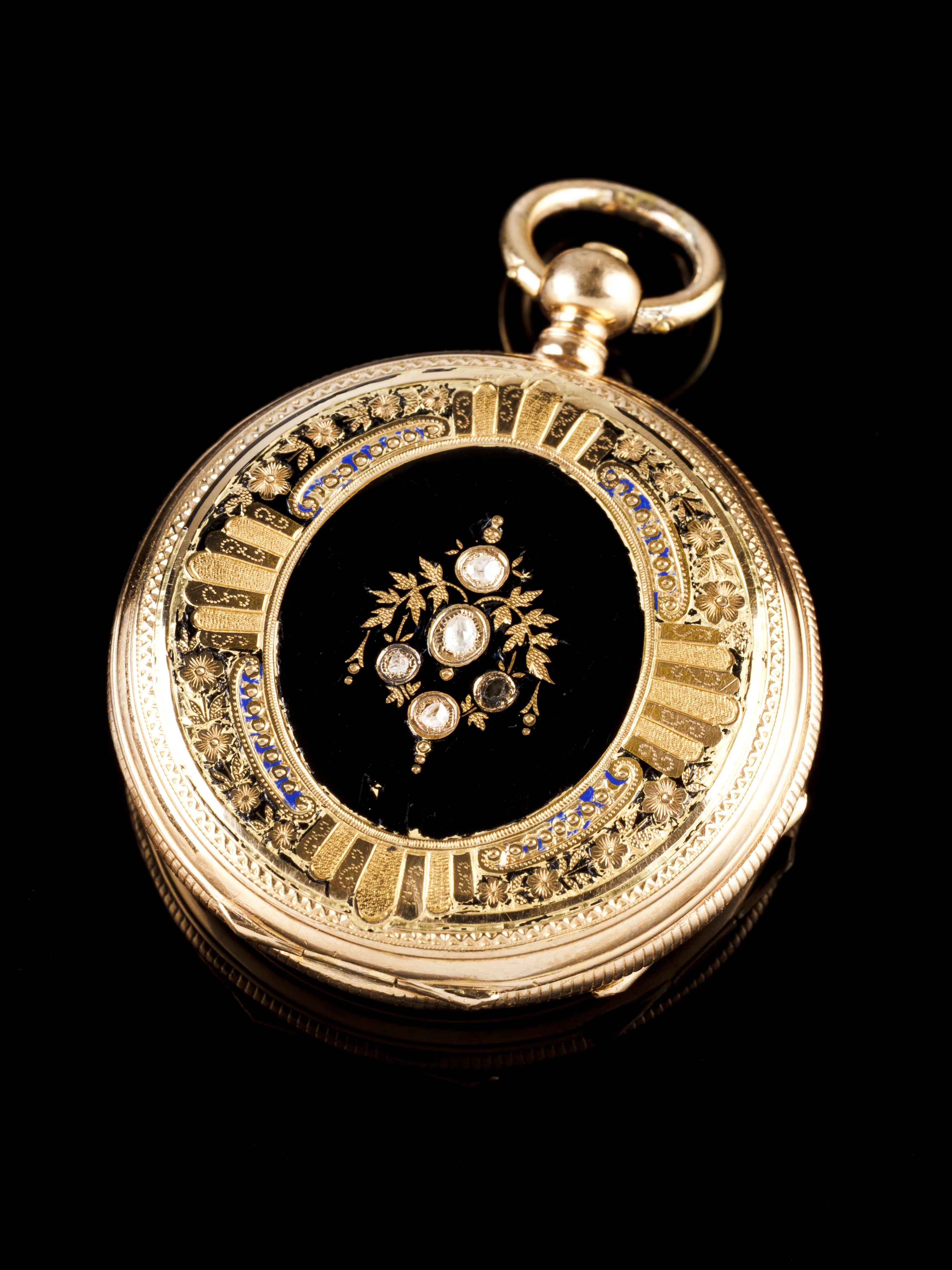 An Ancre lapel watch with (750/000)t gold case decorated with floral motifs, 36mm case. Mechanical key movement, set with 5 stones. Ceramic dial with restoration at 2/3h. Second half of the 19th century. With key and case. Working