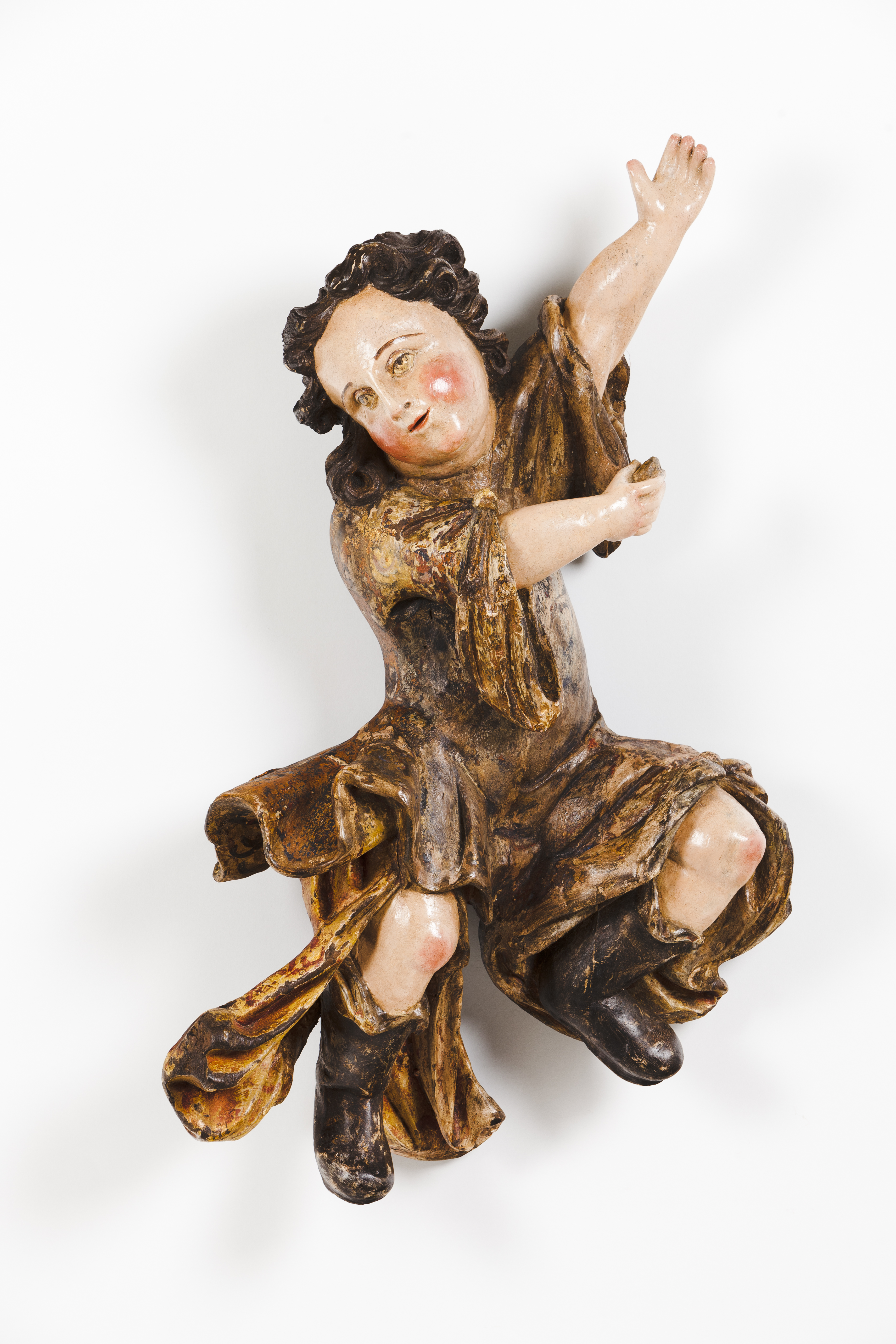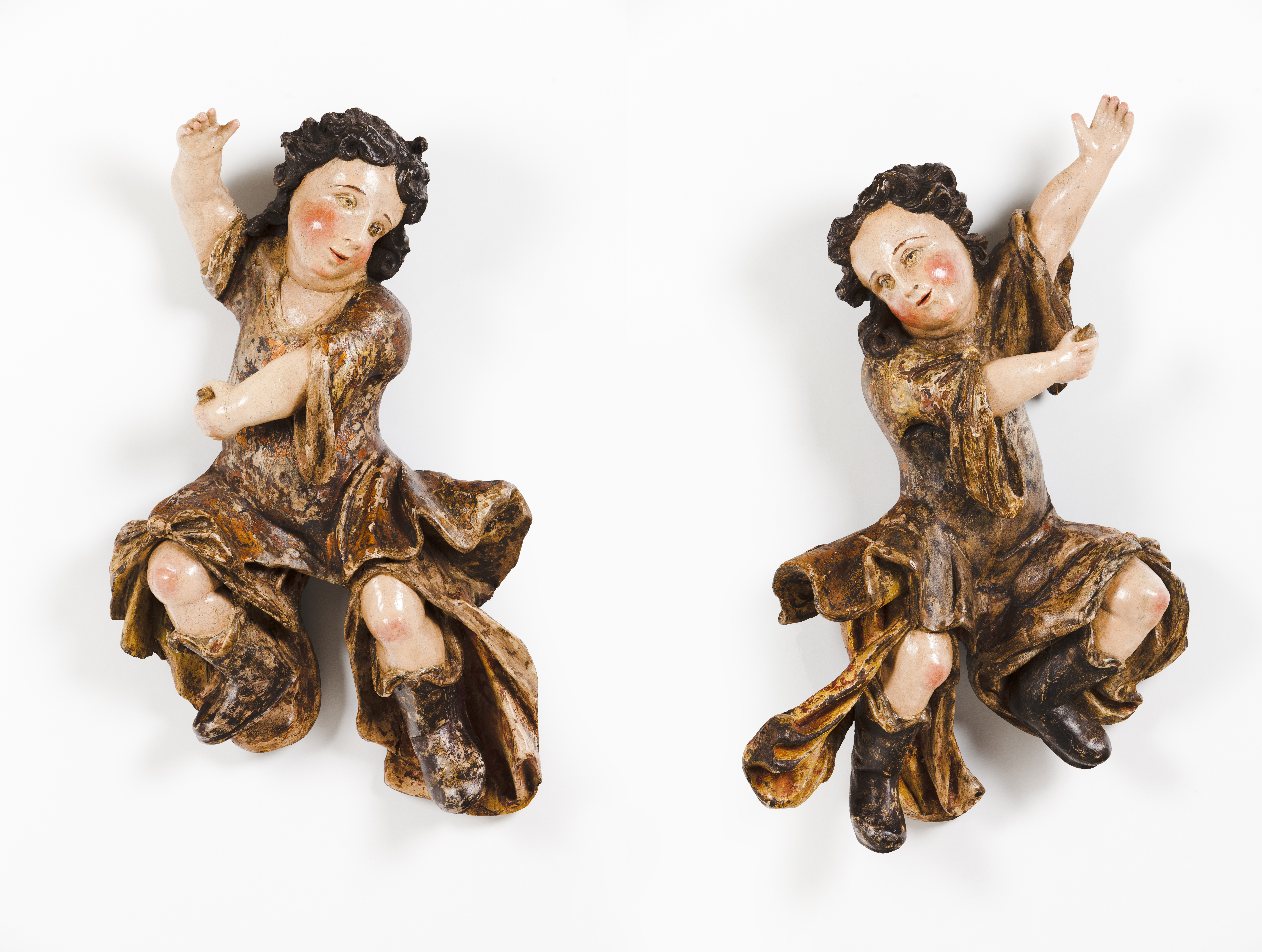 A pair of carved and polychrome wooden suspension sculptures