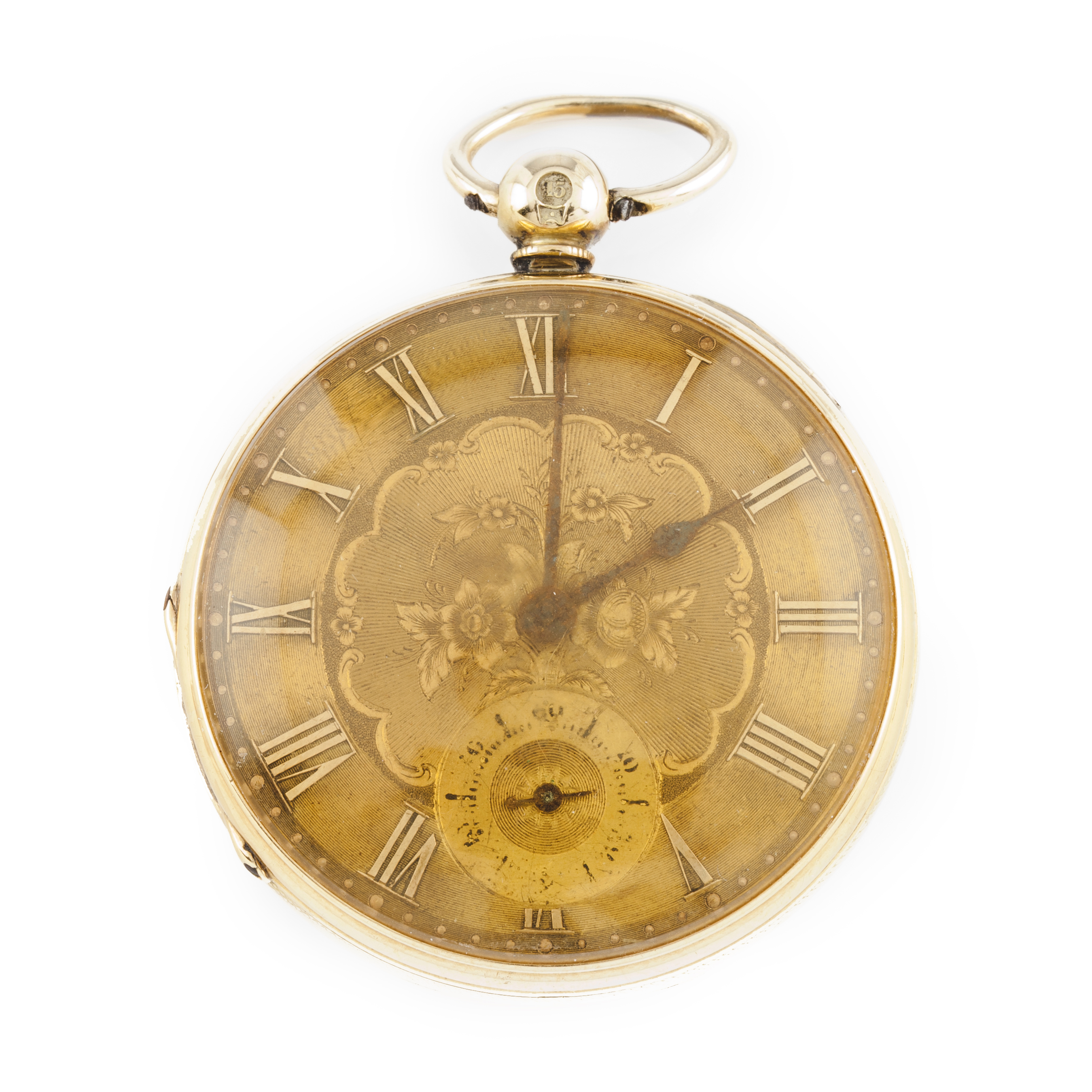 Pocket watch. Winding mechanical movement with adjustment mechanism. Yellow gold (750/000) case. Dial with roman numerals. Needs servicing.