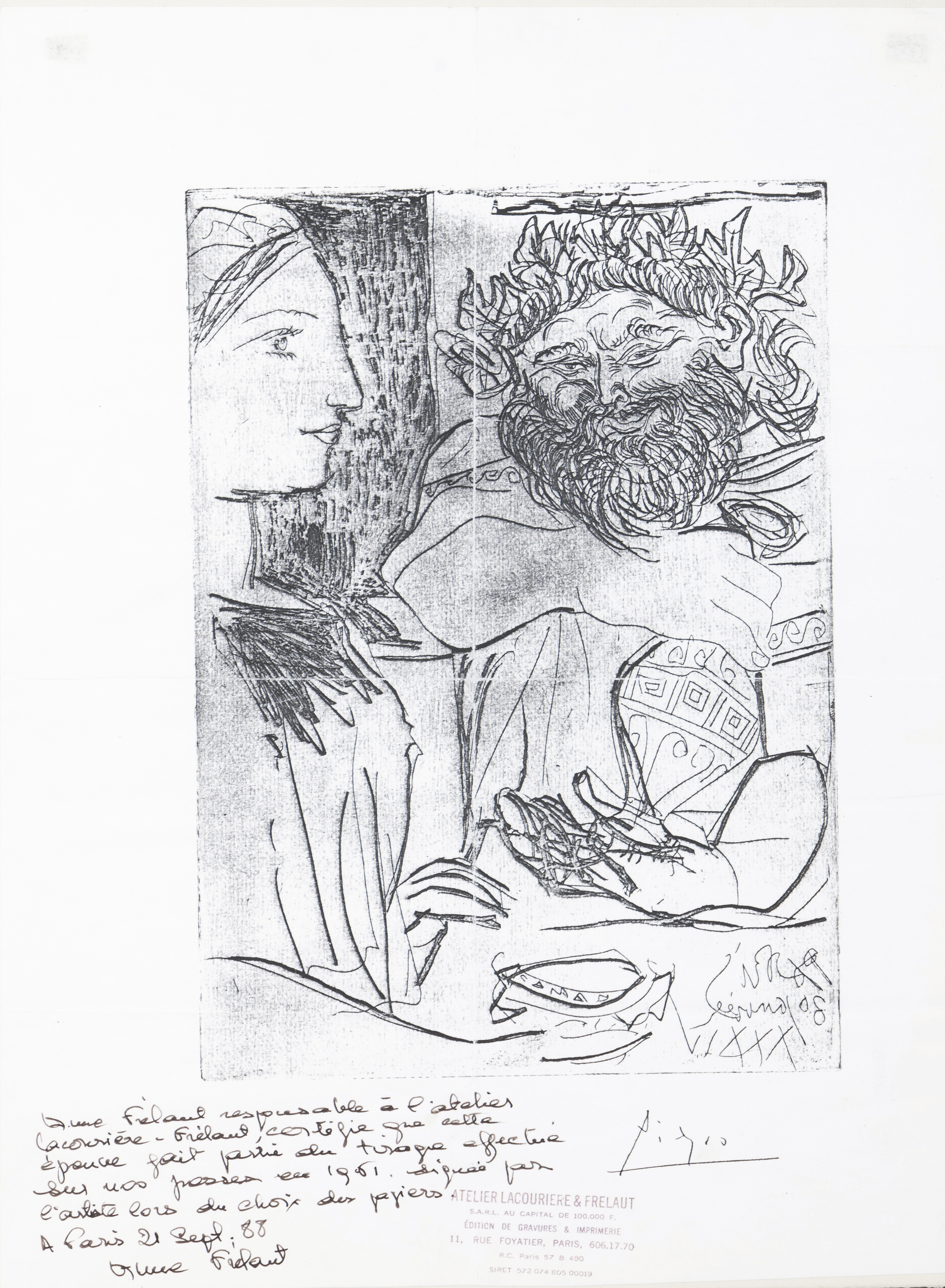 "PicassoCom certificado assinado por Anne Frélaut, datado de 88 e com carimbo do Atelier Lacourière & Frélaut.