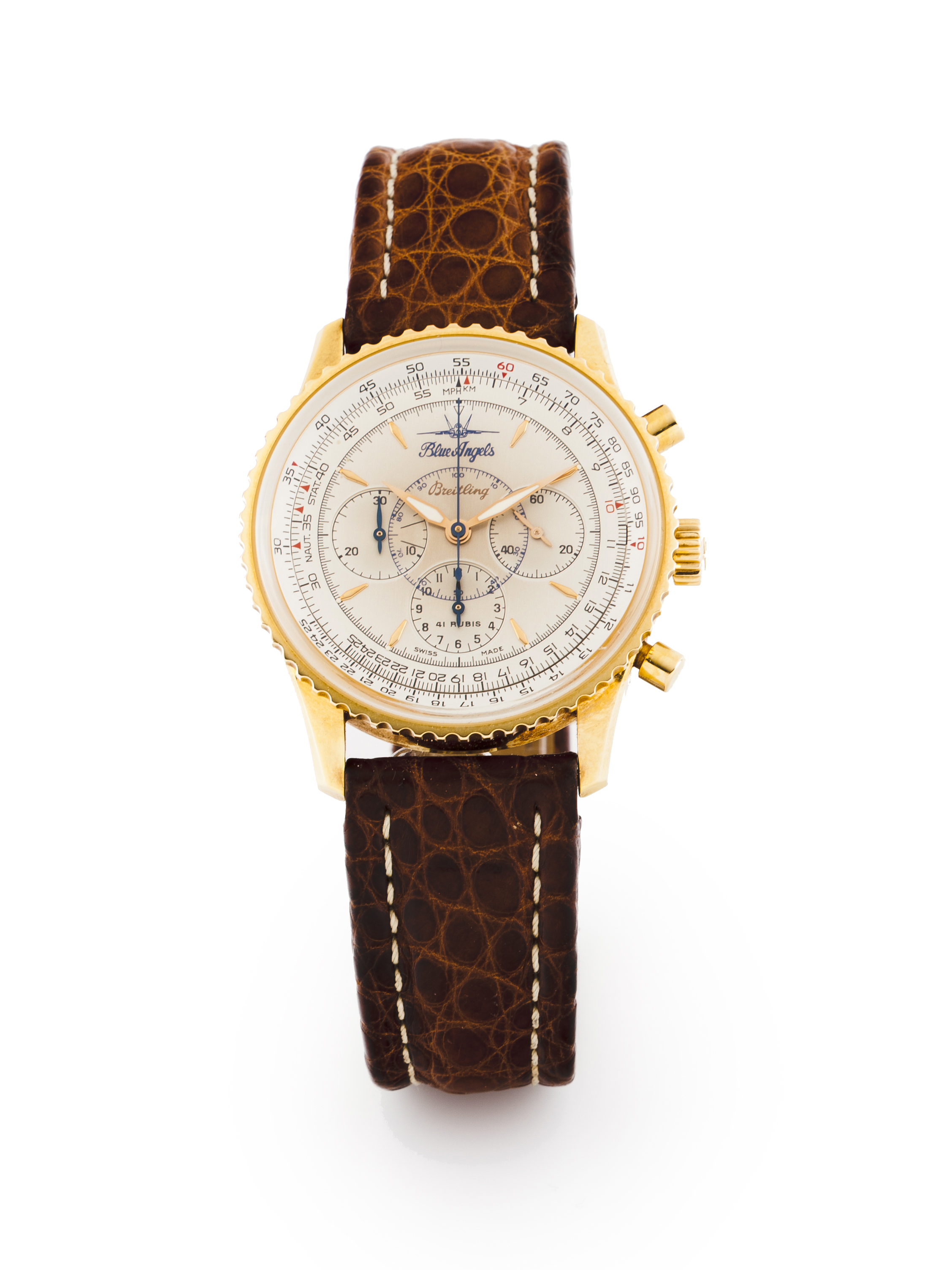 Navitimer model, Blue Angels limited edition with Nº 413/1000. Automatic mechanical movement with chronograph function. Yellow gold case (750/000). With box, without documents.