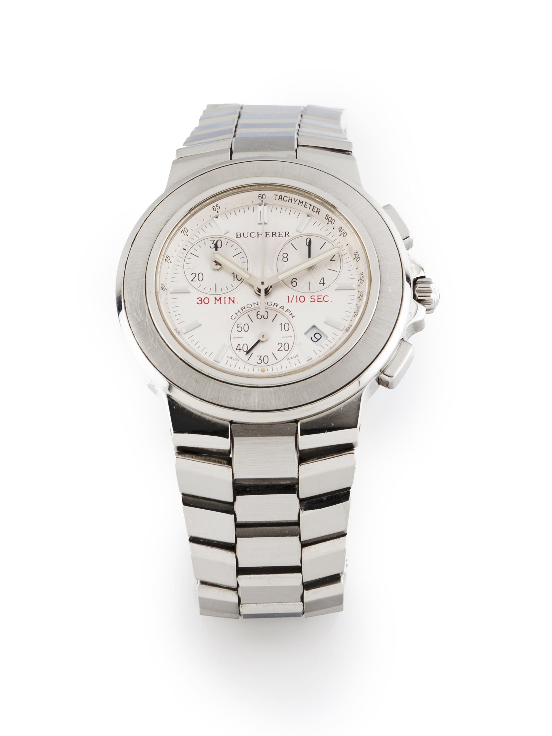 Bucherer watch. Capolago model. Quartz movement with chronograph function and date at 16h/17h. With watch box and certificate. Stainless steel case and wristband. With wear signs.