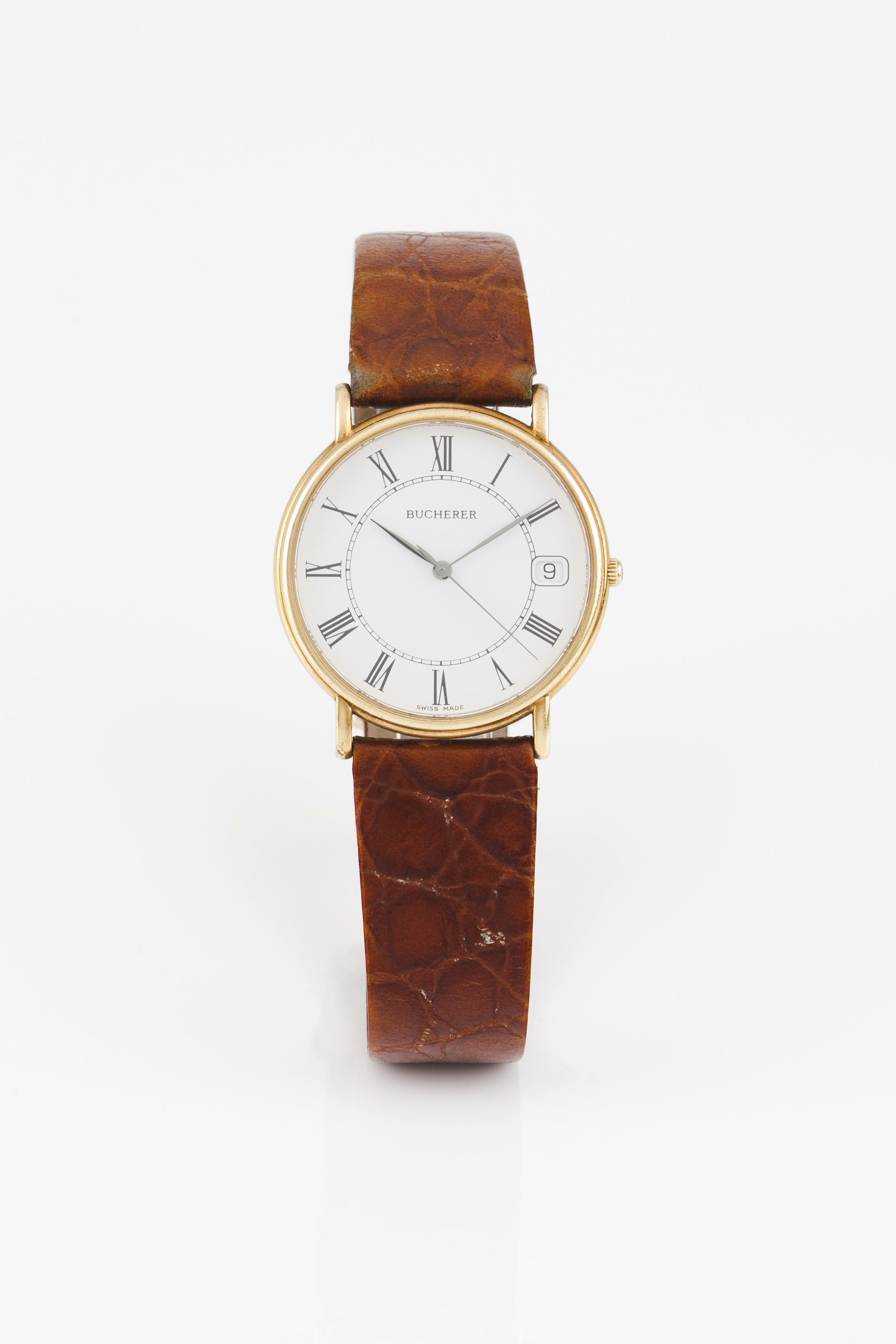 Bucherer watch. Quatz movement with date at 3h. Gold (750/000) case. With wear signs.