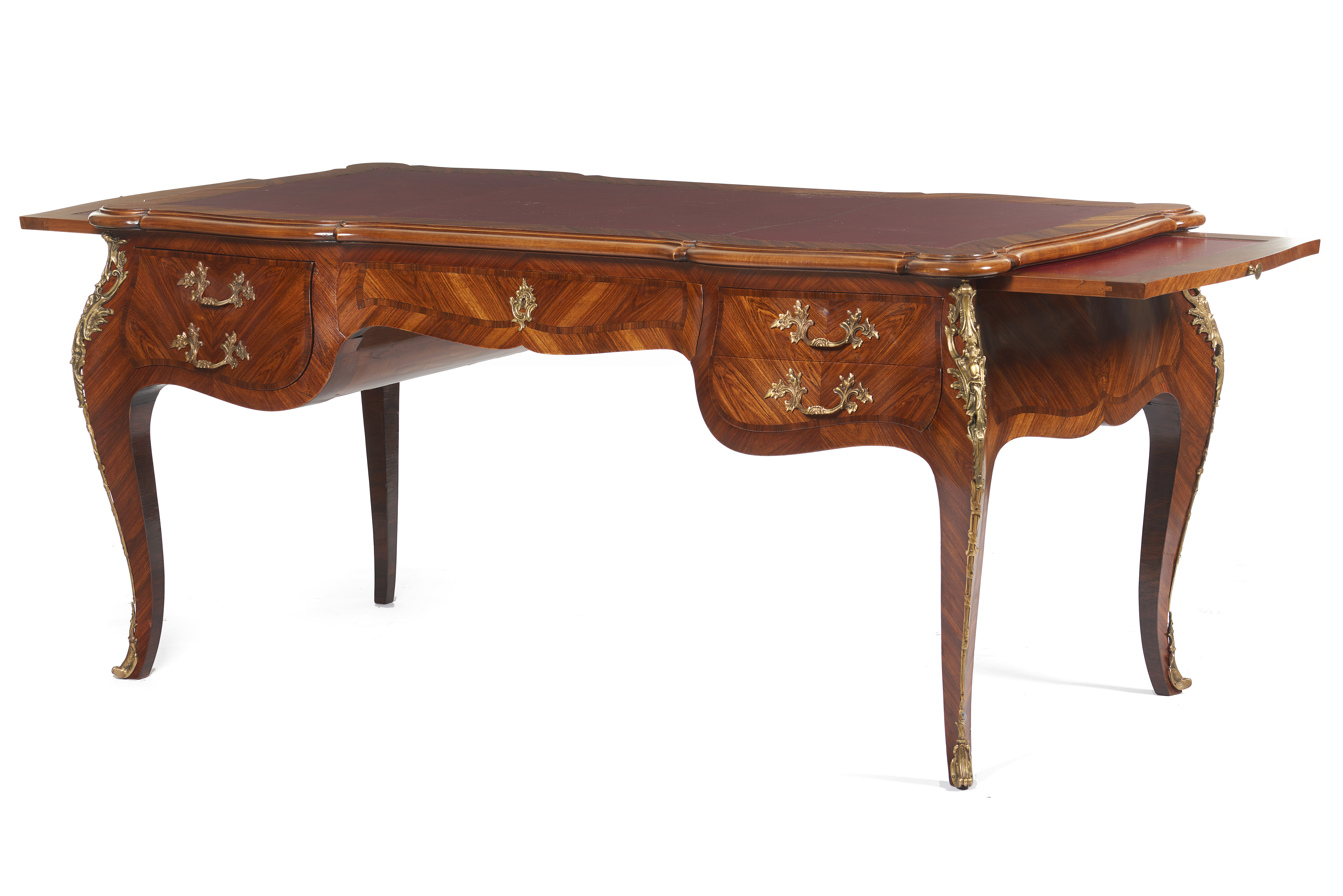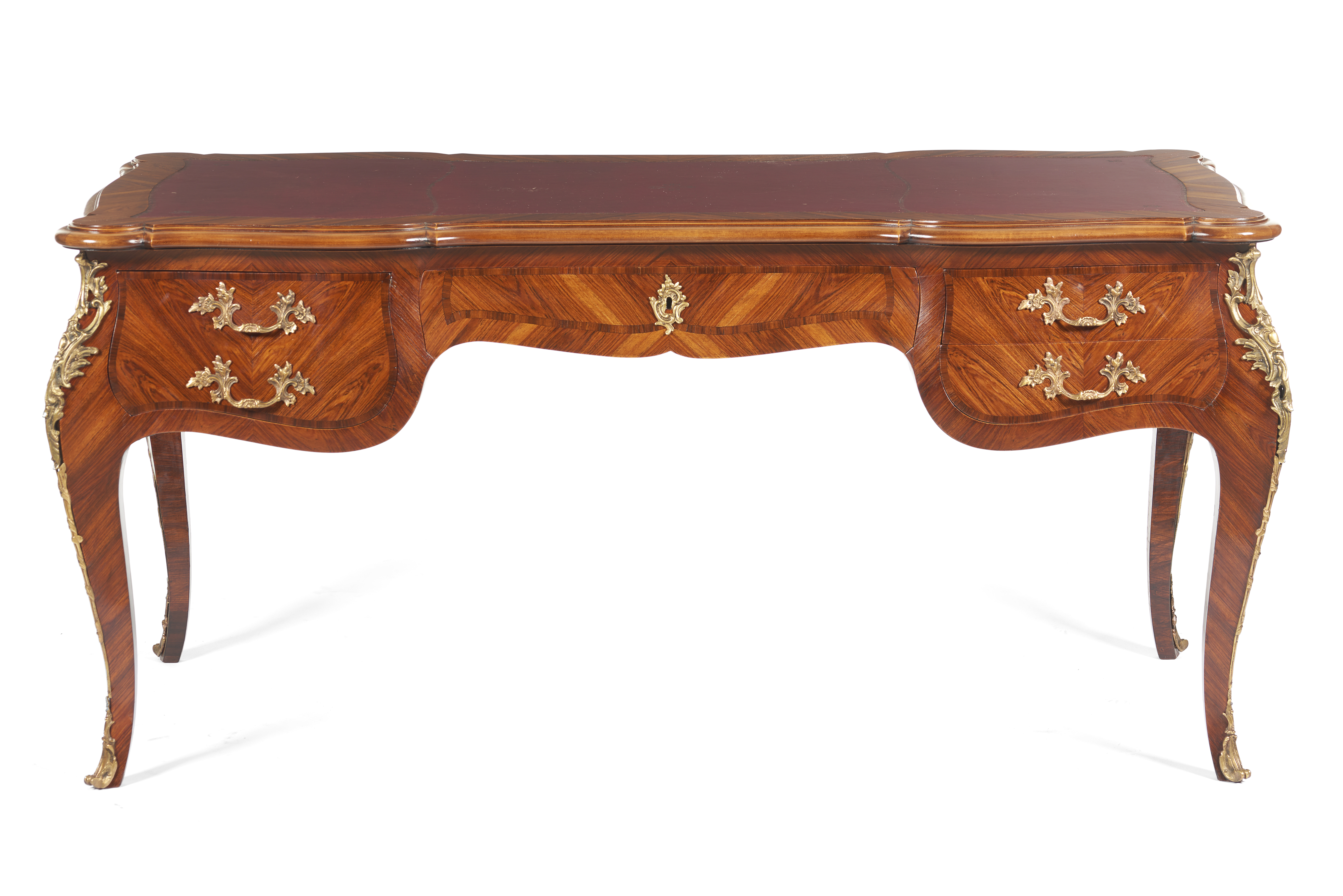 Geometrically veneered tulipwood with tulipwood inlay, with a cut top covered in red leather, cabriole legs, five drawers, a stretcher on each side, and gilt bronze hardware