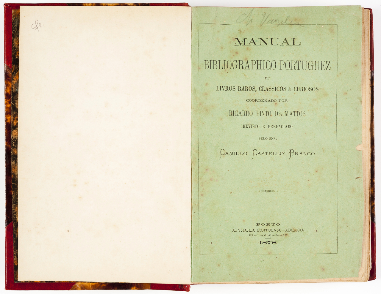Manual bibliográfico português de livros raros, classicos e curiosos coordenado por (...) Revisto e prefaciado por... Porto: Livraria Portuense-Editora, 1878. - [12], 582, [2] p. : (22 cm) : Enc. Exemplar aparado somente à cabeça, parcialmente por abrir. Bom exemplar, apesar de alguma acidez nas páginas iniciais e finais. Encadernação meia-francesa, com cantos, ferros a ouro na lombada, mantendo a capa de brochura anterior, muito bem conservada. Primeira edição, pouco vulgar.