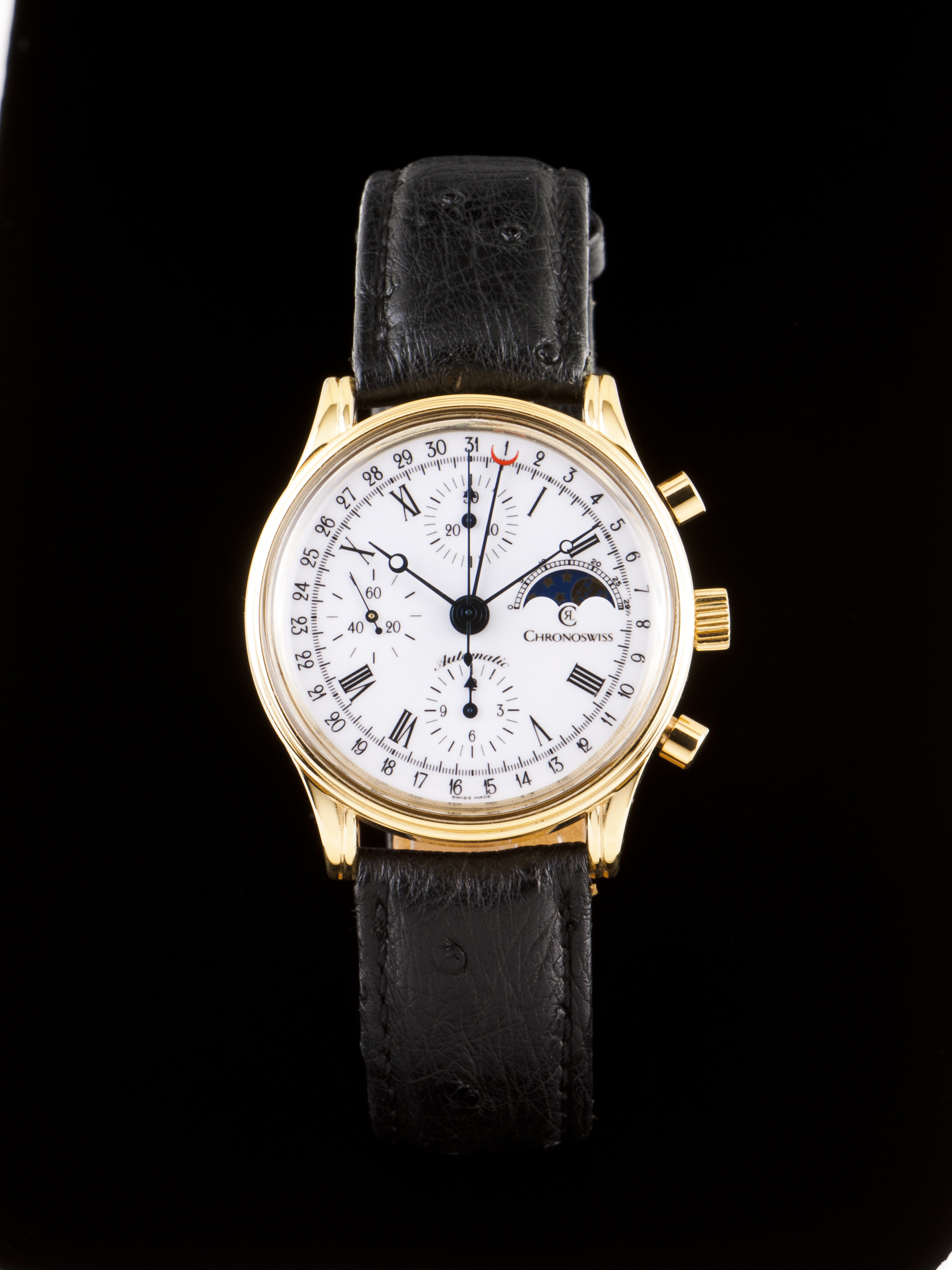 A Chronoswiss Alfred Rochat Lunar watch with plated 38mm case. Mechanical automatic movement with chronograph, date and moon phases. Porcelain dial. With case, documents, two bracelets and two buckles.