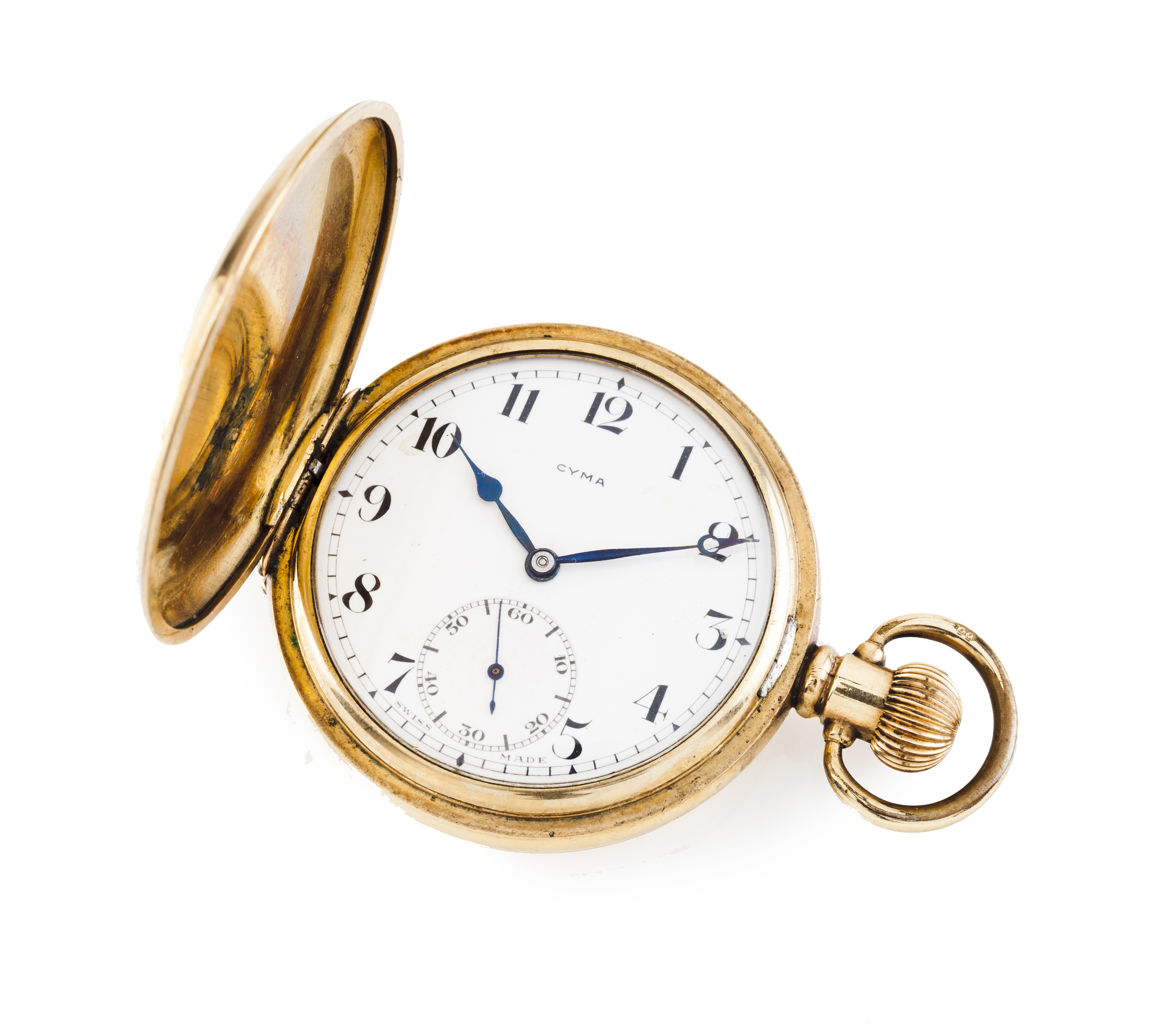 Hunter pocket watch. Winding mechanical movement with adjustment mechanism. Yello gold plated case with 3 covers. Dial with arabic numerals. With wear signs.