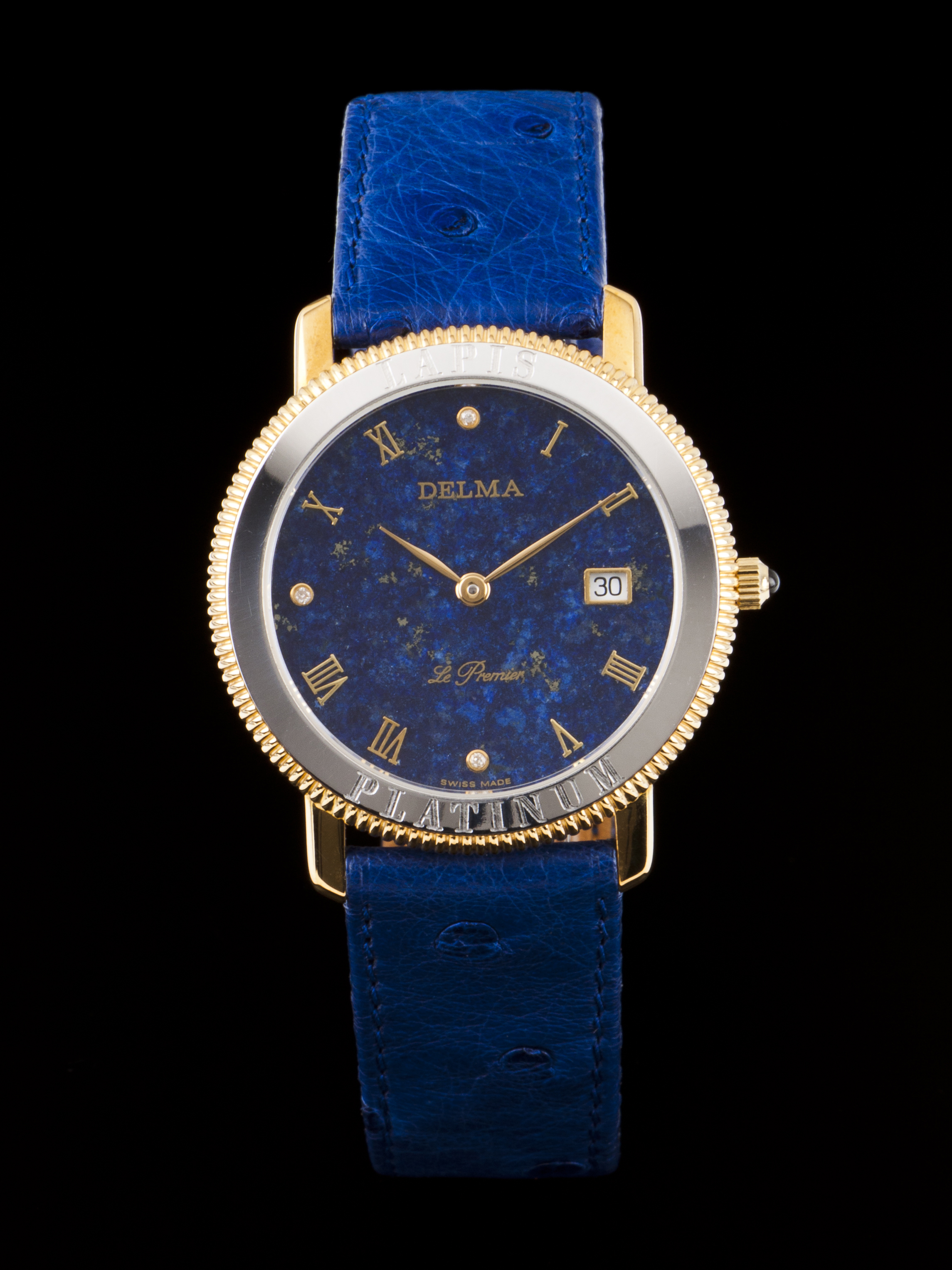 Delma with a 36mm diameter gold case, platinum bezel and dial in Lapis Lazuli. Quartz movement with date at 3 o'clock. Watch in excellent condition, without apparent use. Contains box and documentation.