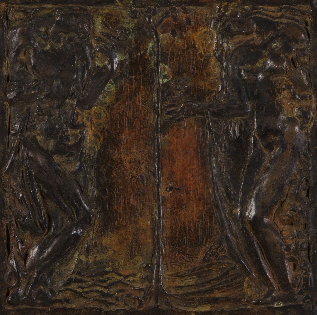 A patinated bronze plaque