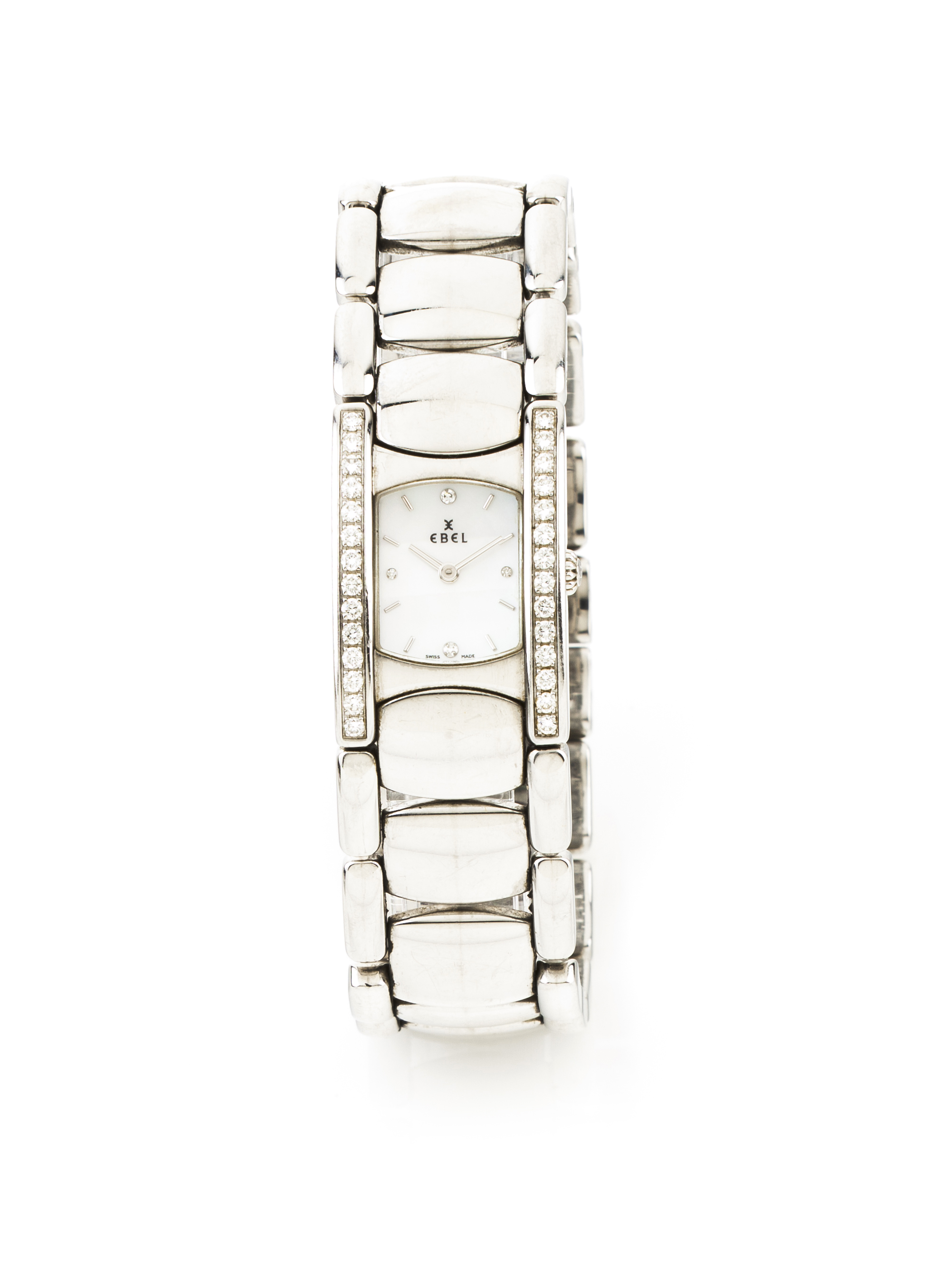 Quartz movement. Stainless steel case and wristband. Mother of pearl dial. With wear signs.