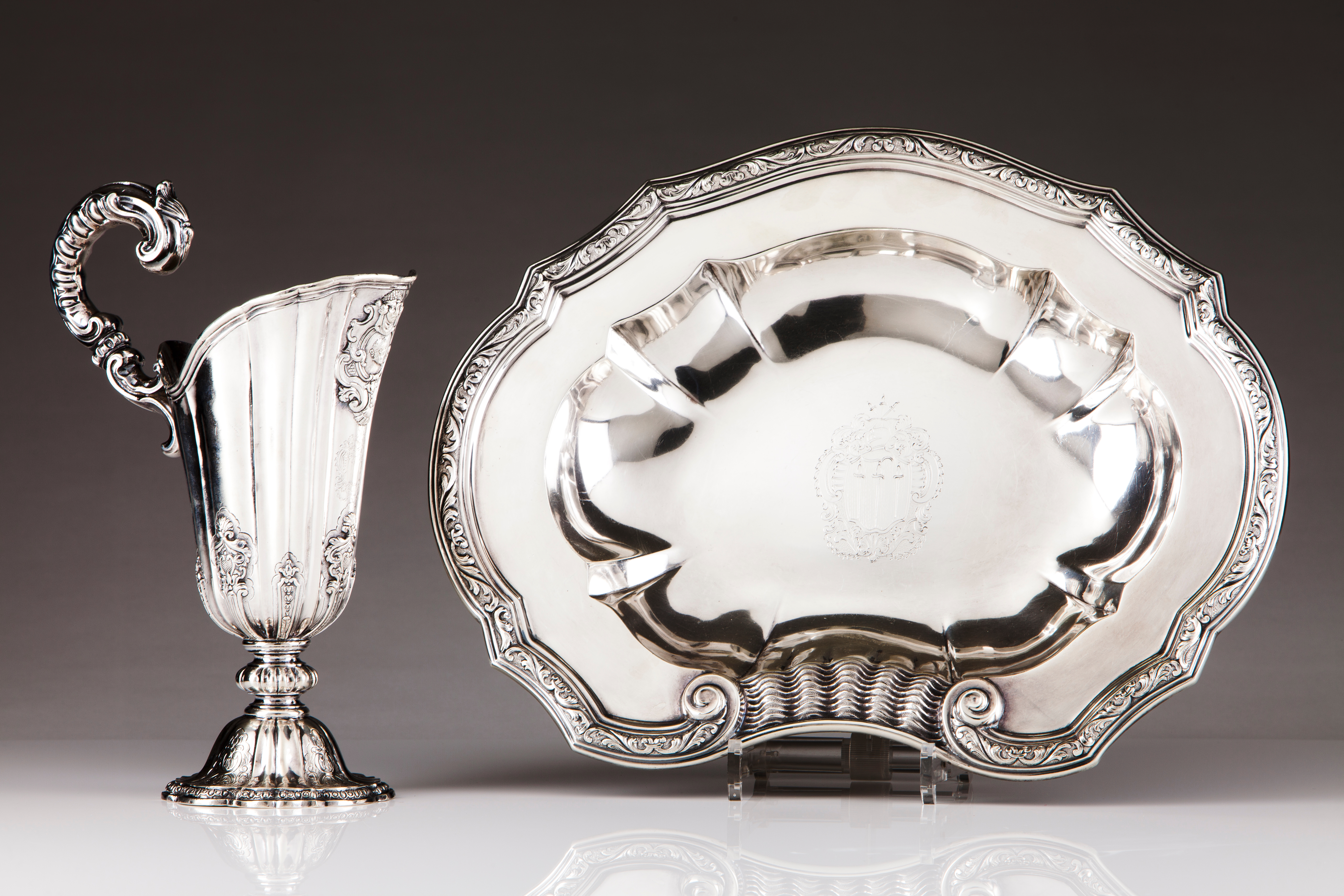 Fluted ewer with relief and chiselled baroque decoration with floral motifs and volutes, engraved with Valle coat-of-arms at the front and decorated in relief with cartouche with mask and classical profile