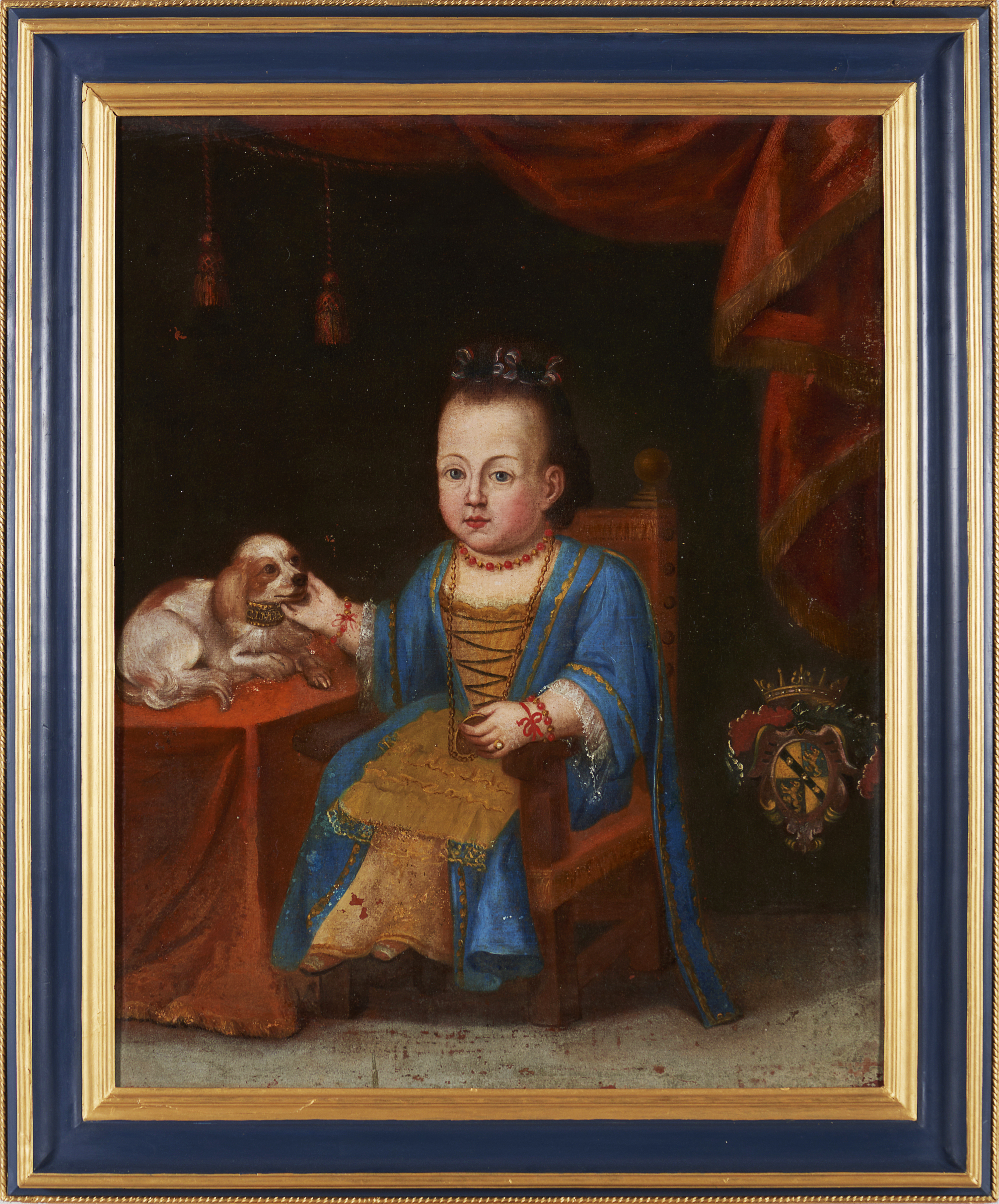 A portrait of a girl with dog and armorial shield