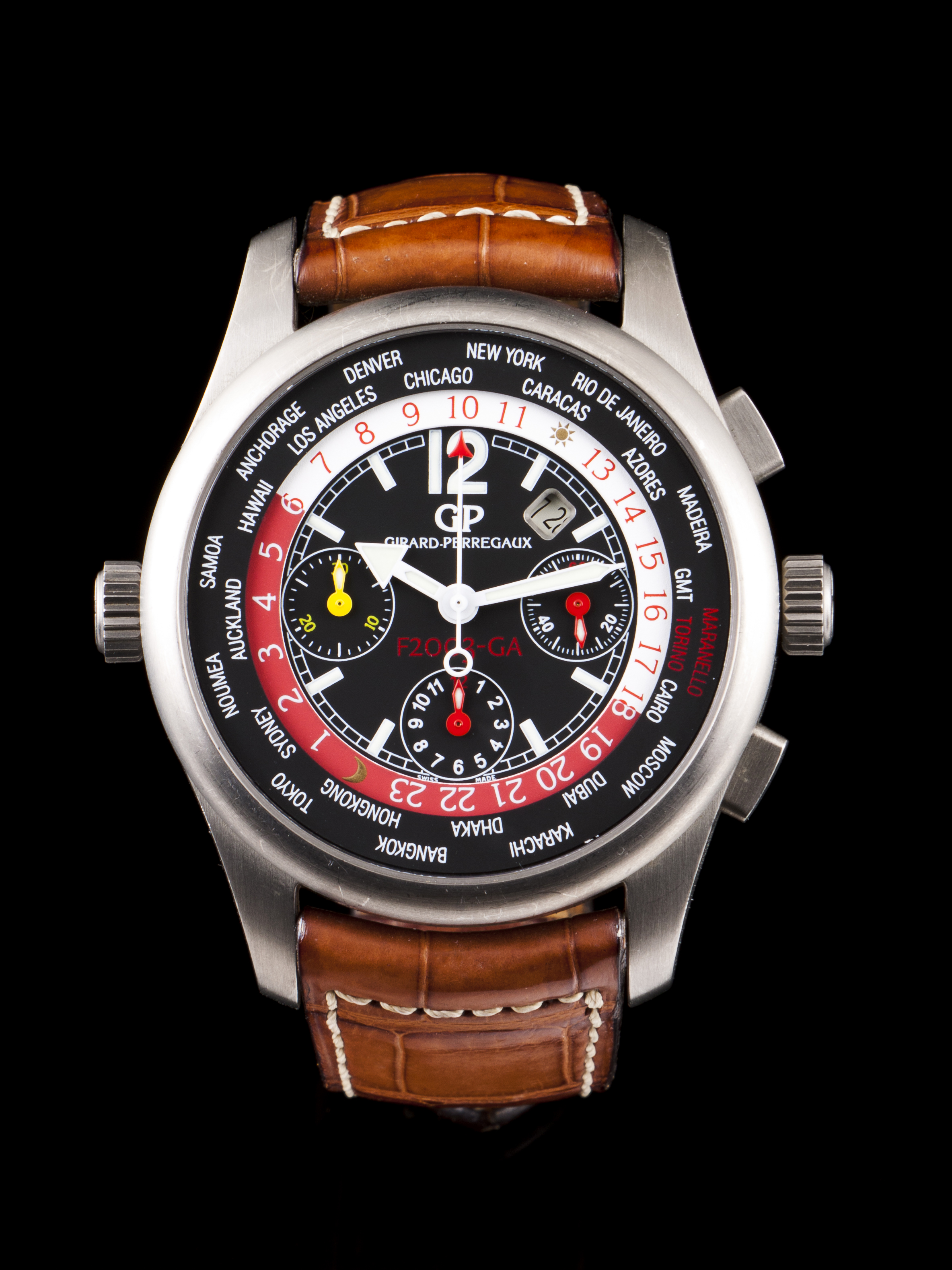 A rare Girard Perregaux Ferrari F2003-GA model (Giovaanni Agnelli tribute), ref. 4980, with 43mm diameter titanium case. Limitd edition of 99 pieces, being this nr. 33. Mechanical automatic movement, cal. 3387, 63 jewels with chronograph, world hours (rotative scale wuth 24 cities) and date. With outer and inner case. In good condition with wear signs