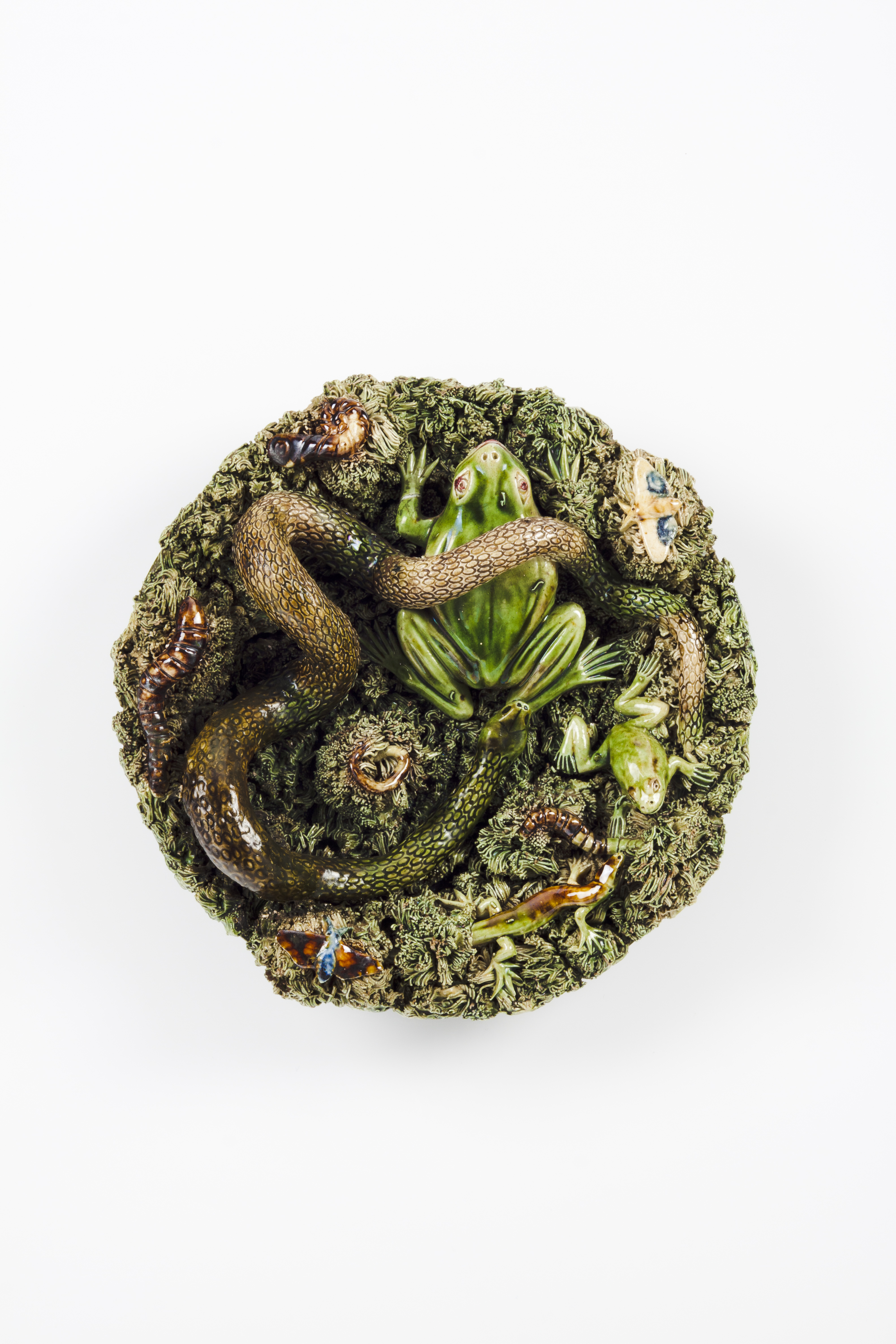 In molded, shaped, glazed and polychrome red terracotta representing reptiles and frogs on moss