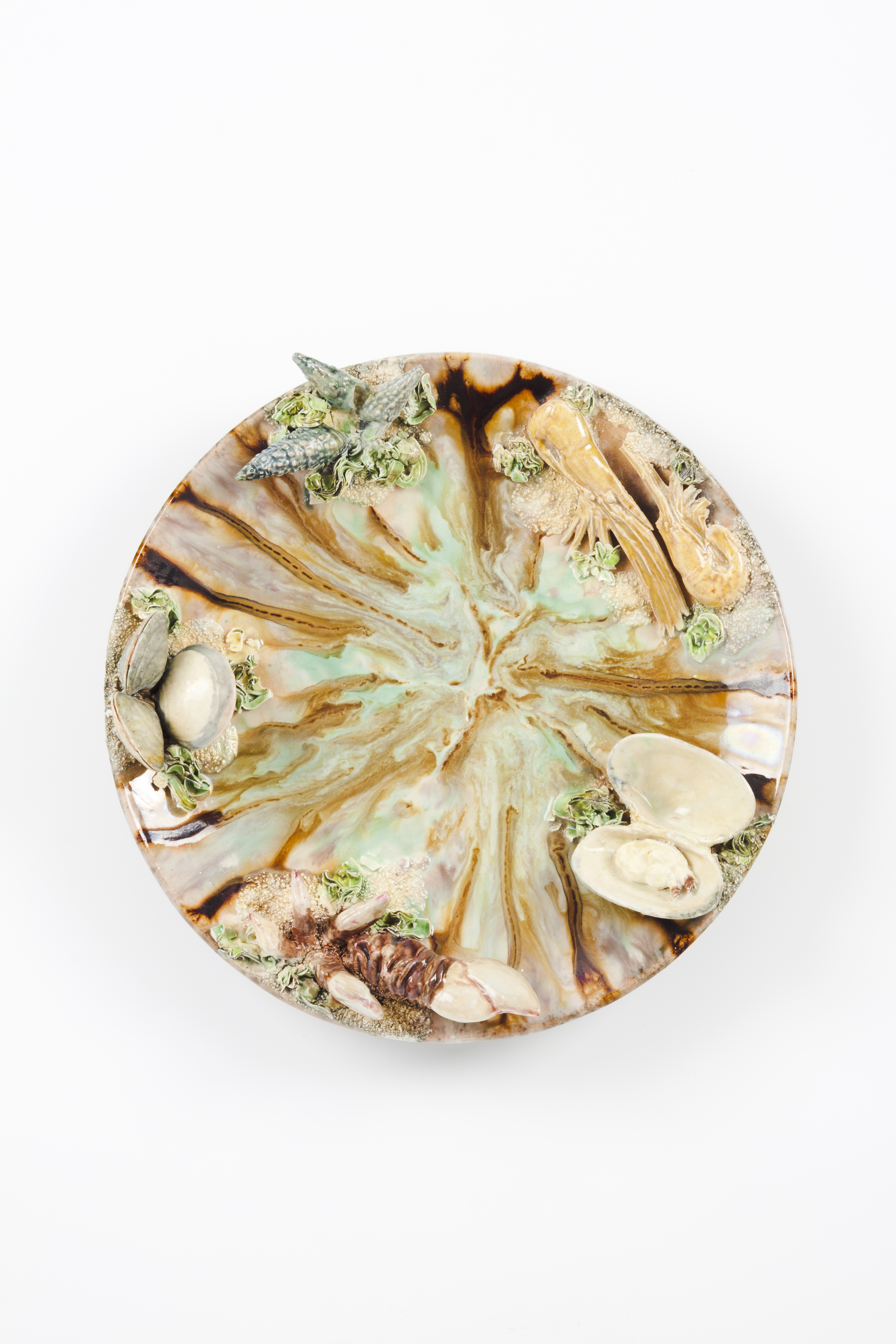 In molded, shaped, glazed and polychrome terracotta representing clams, shrimps, cockles and slimes on a drained and stained background