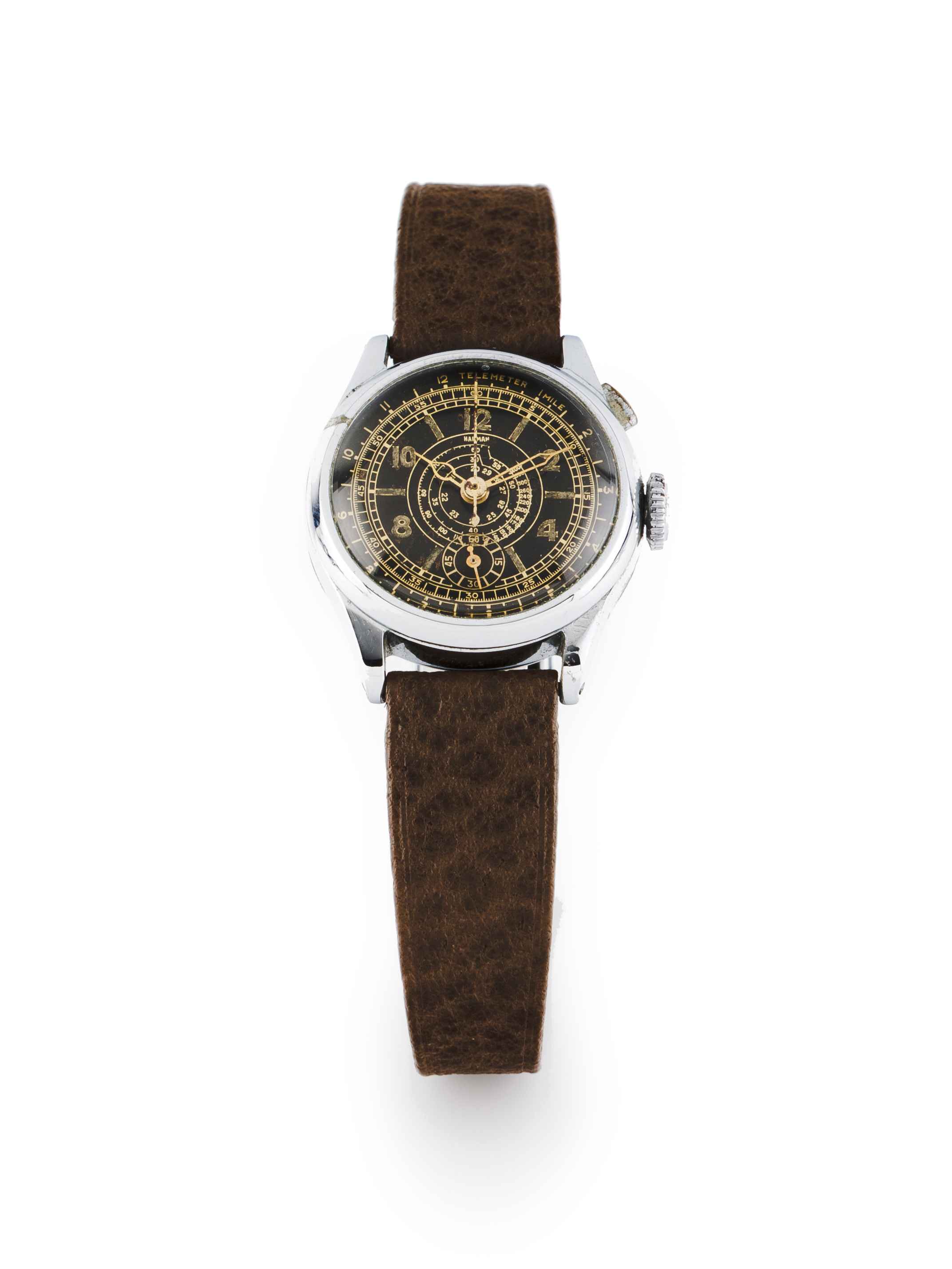 Winding mechanical movement with stoptime function. Stainless steel case. With wear signs.