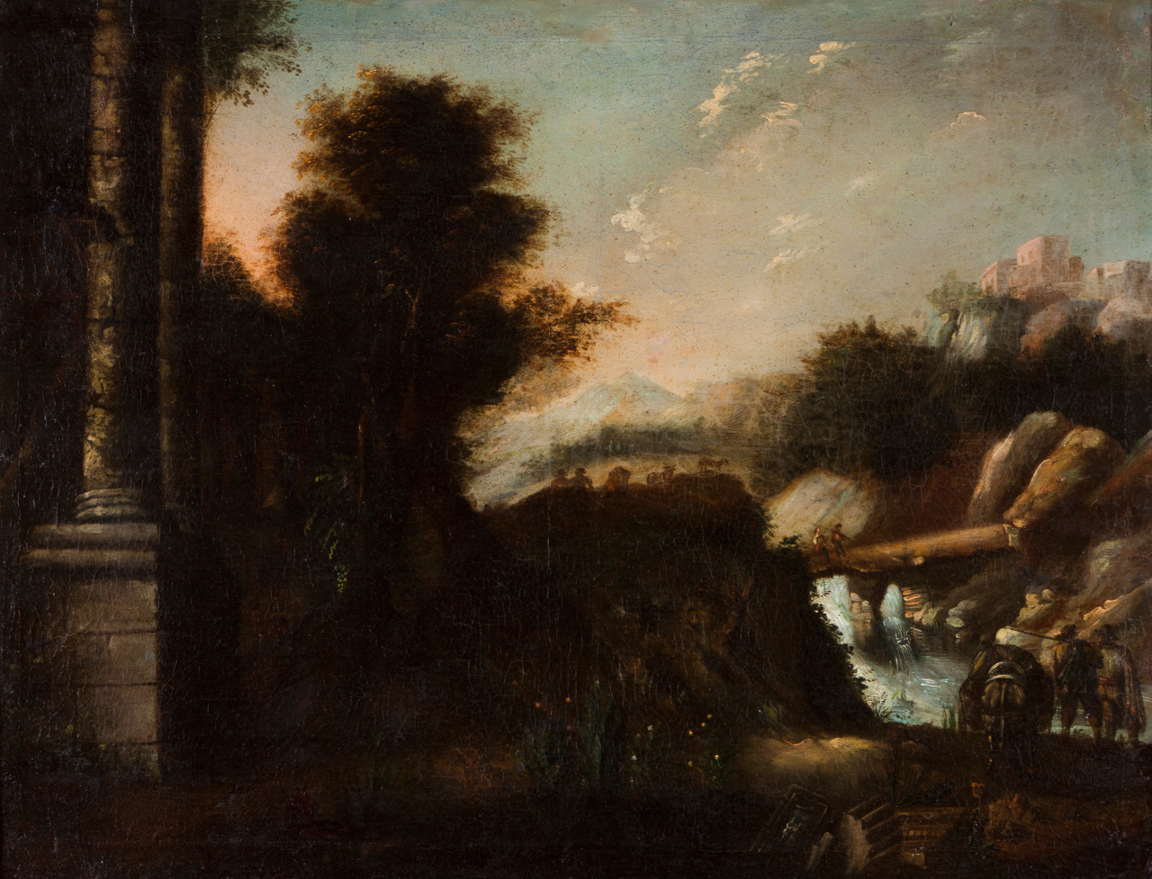 Landscape with ruins, figures and animals
