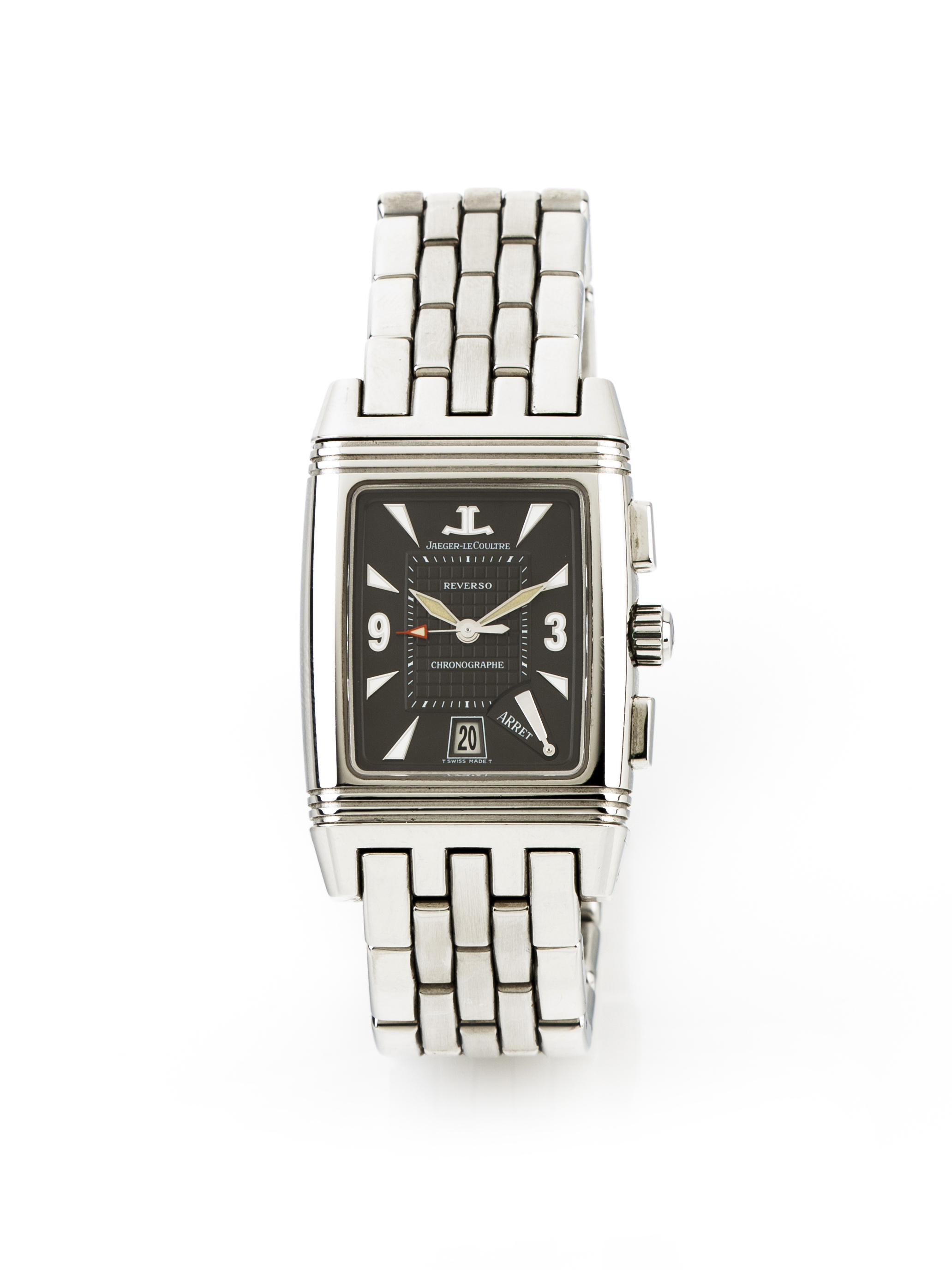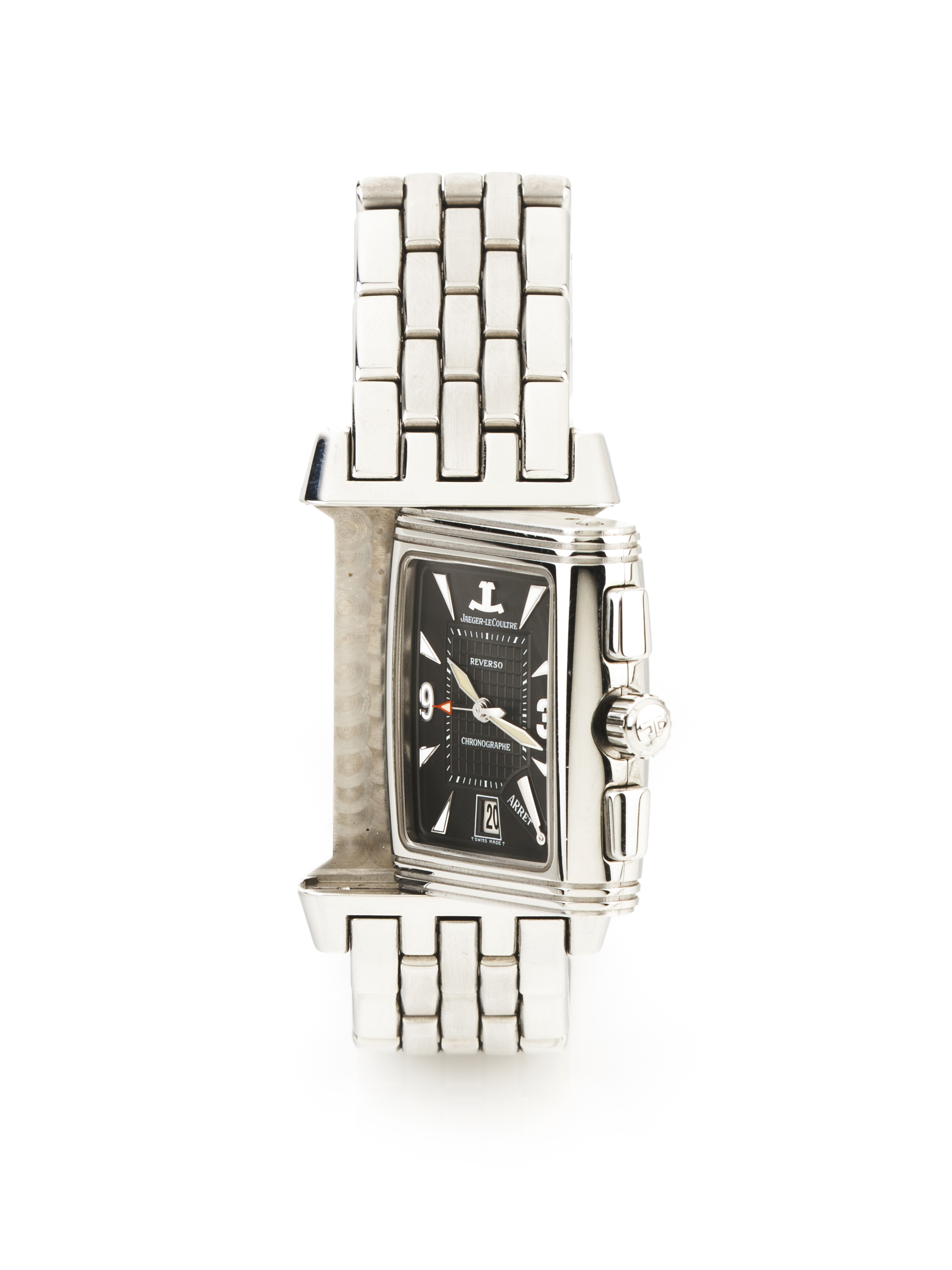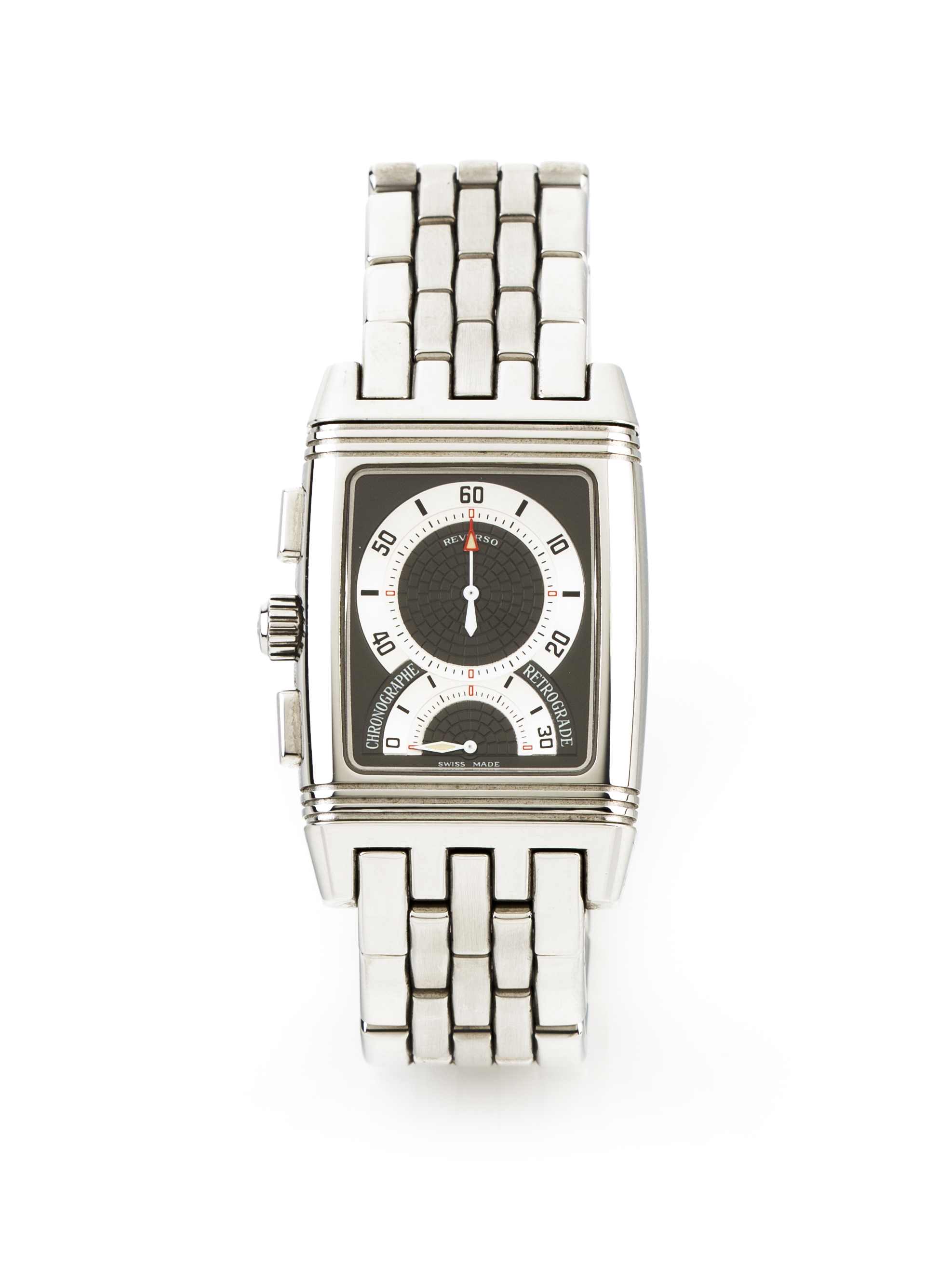 Reverso model with ref. Nº295.8.59. Winding mehcanical movement with chronograph fucntion. Stainless steel case and wristband. In good condition.