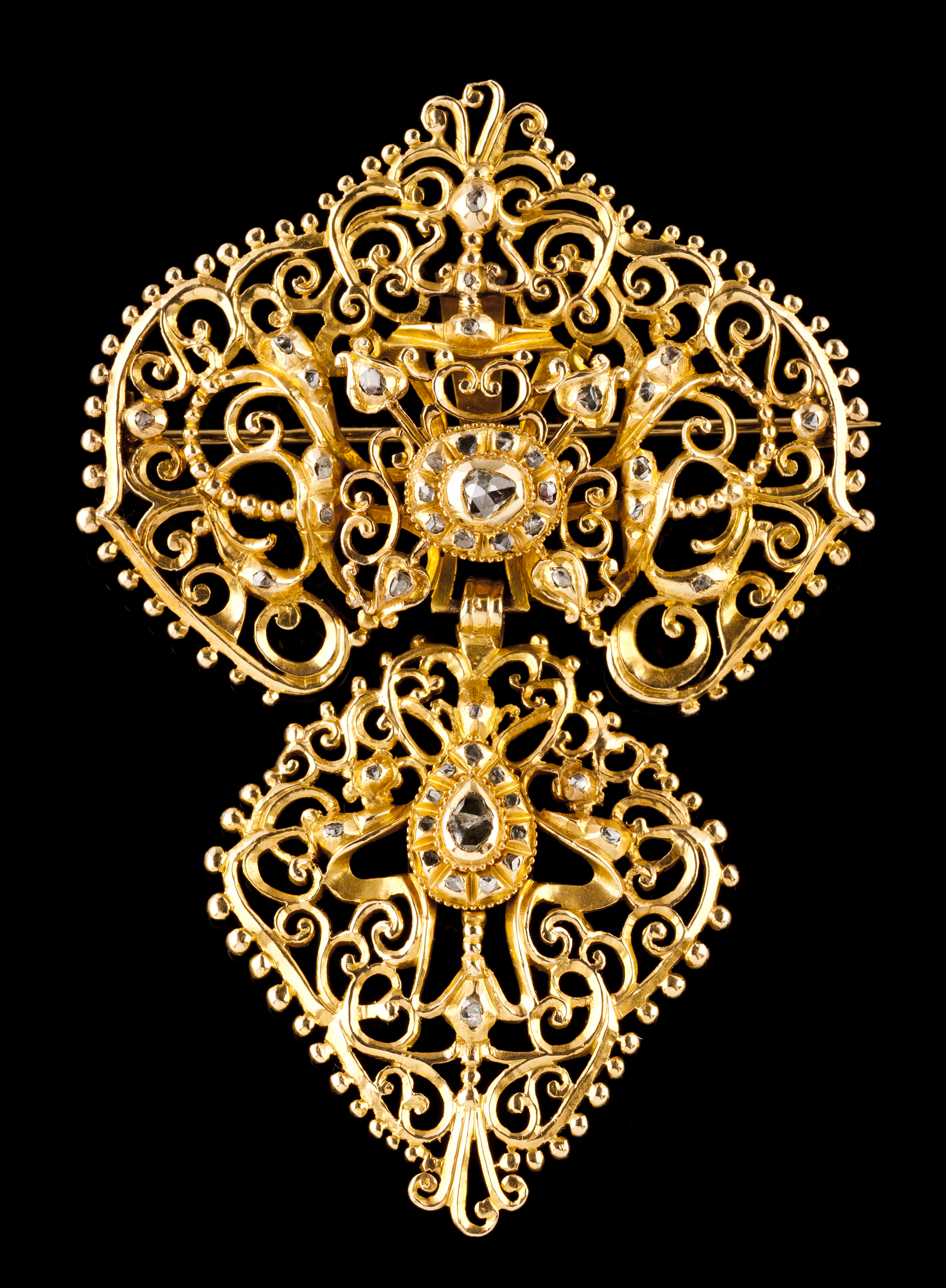Gold with profuse scalloped and chiselled decoration with volutes, floral details and beads, set with 48 rose cut diamonds