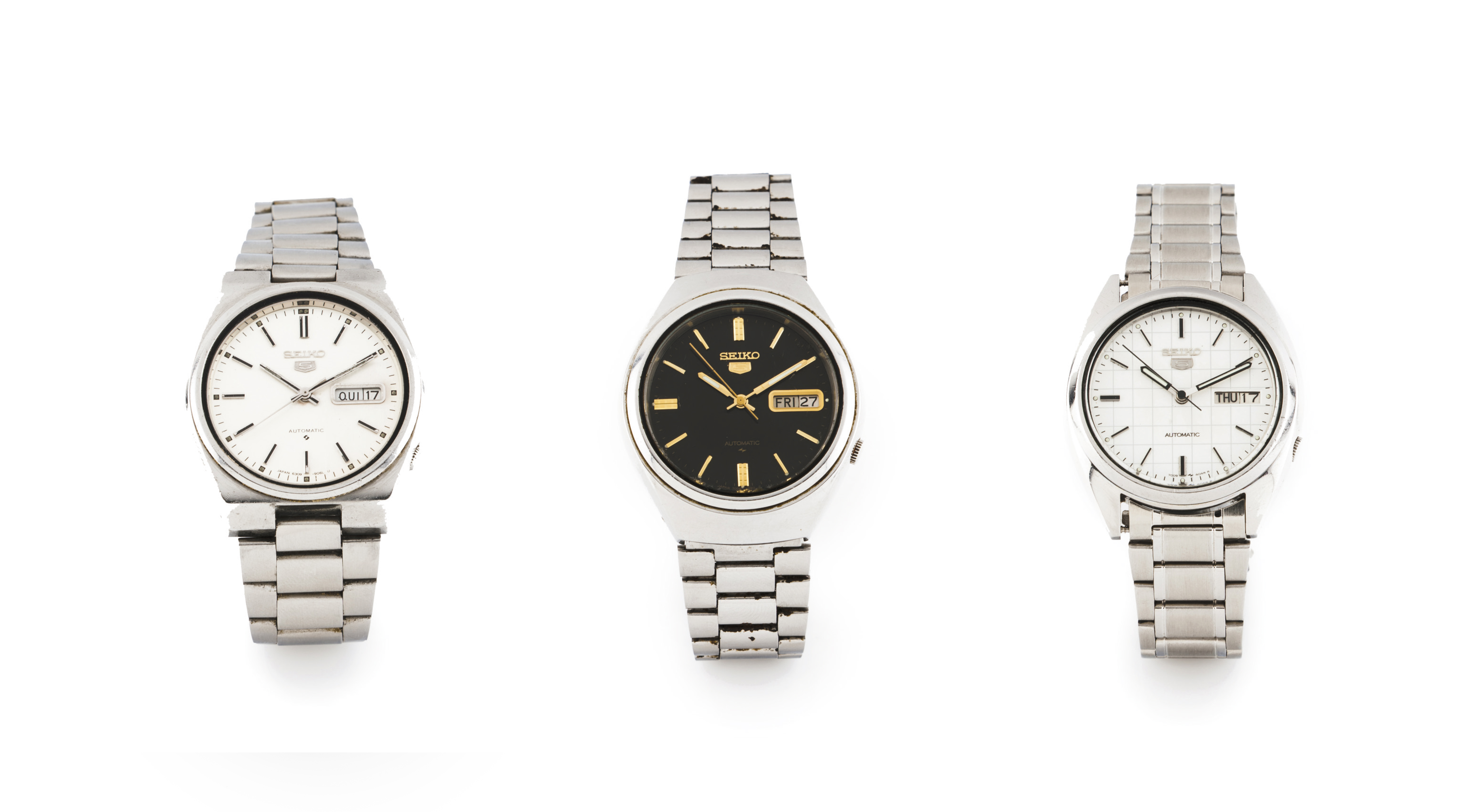 Lot of three Seiko 5 watches. All with steel cases and bracelets. Mechanical movements with week and month day (two in Portuguese). All cases 37mm diameter and working