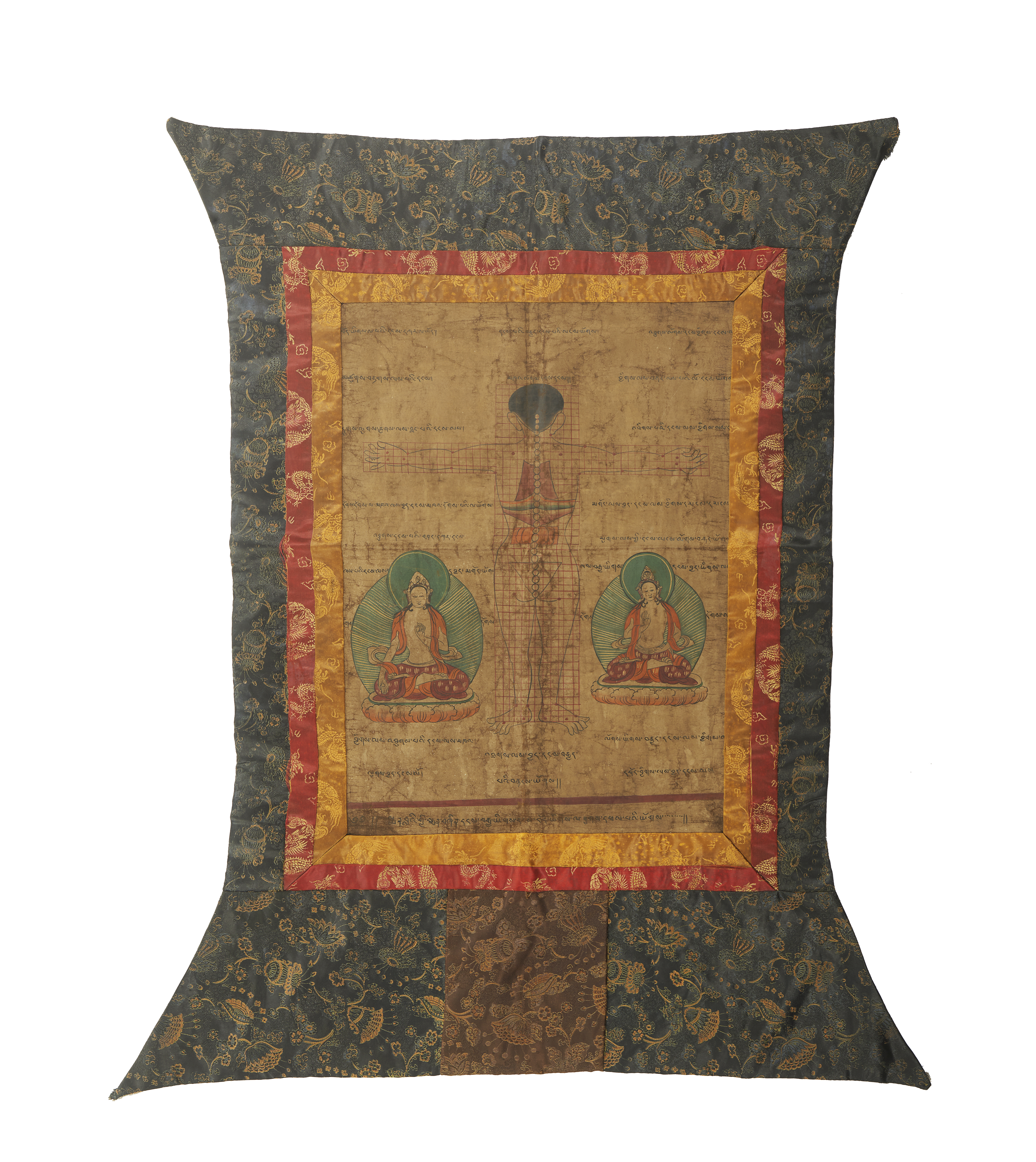 Distemper on cloth. Painted with an anatomical diagram, Buddhist deities, and Tibetan script.