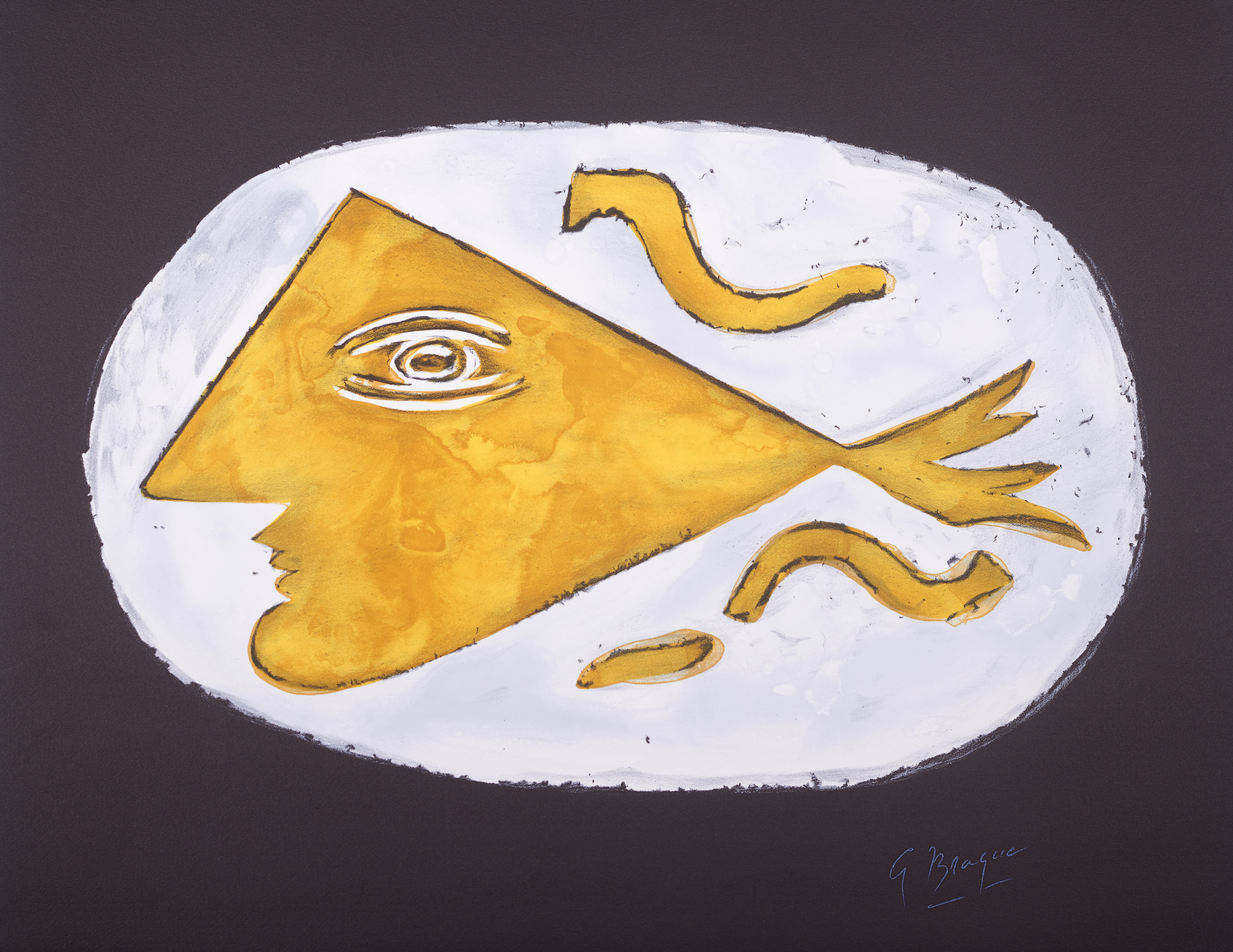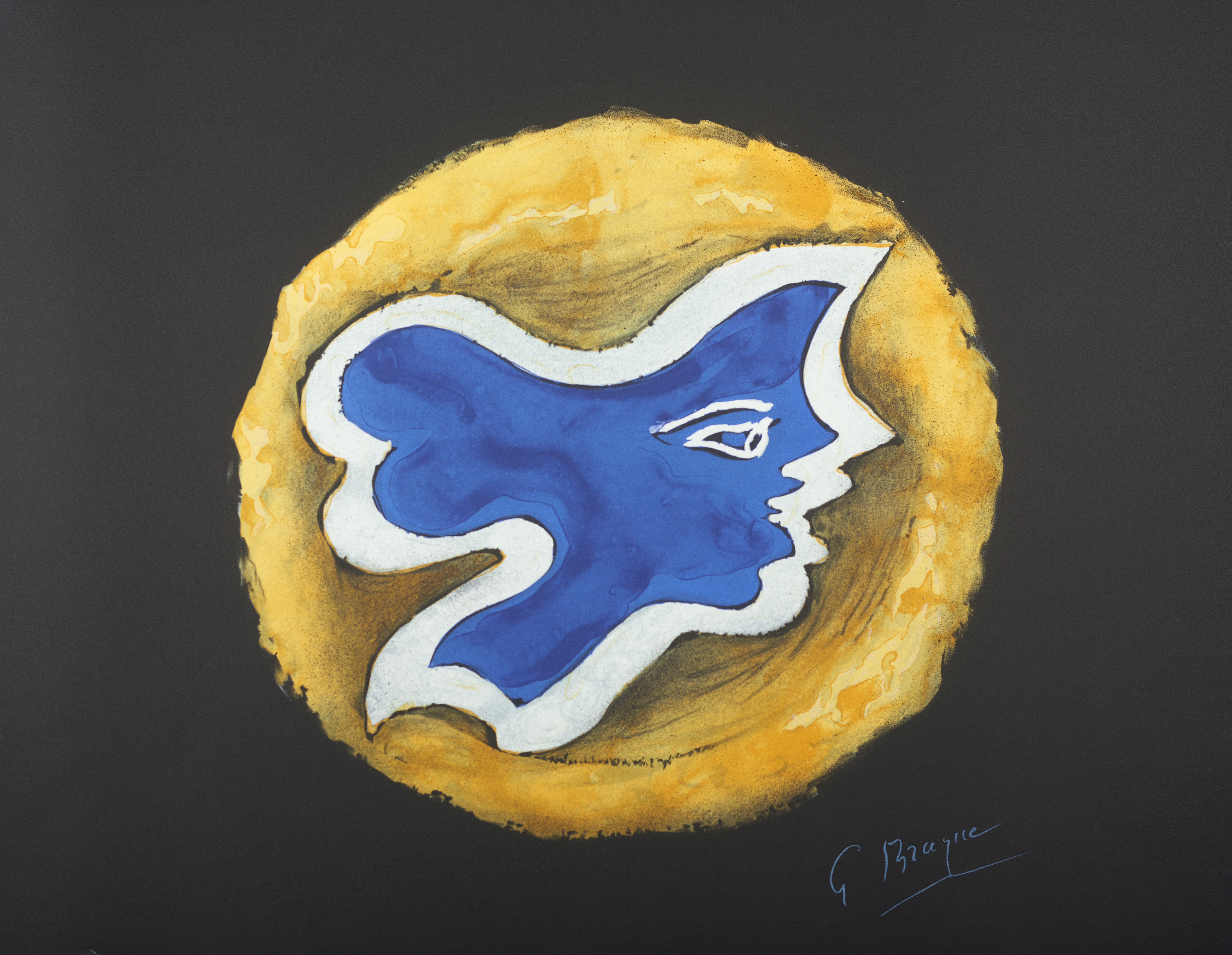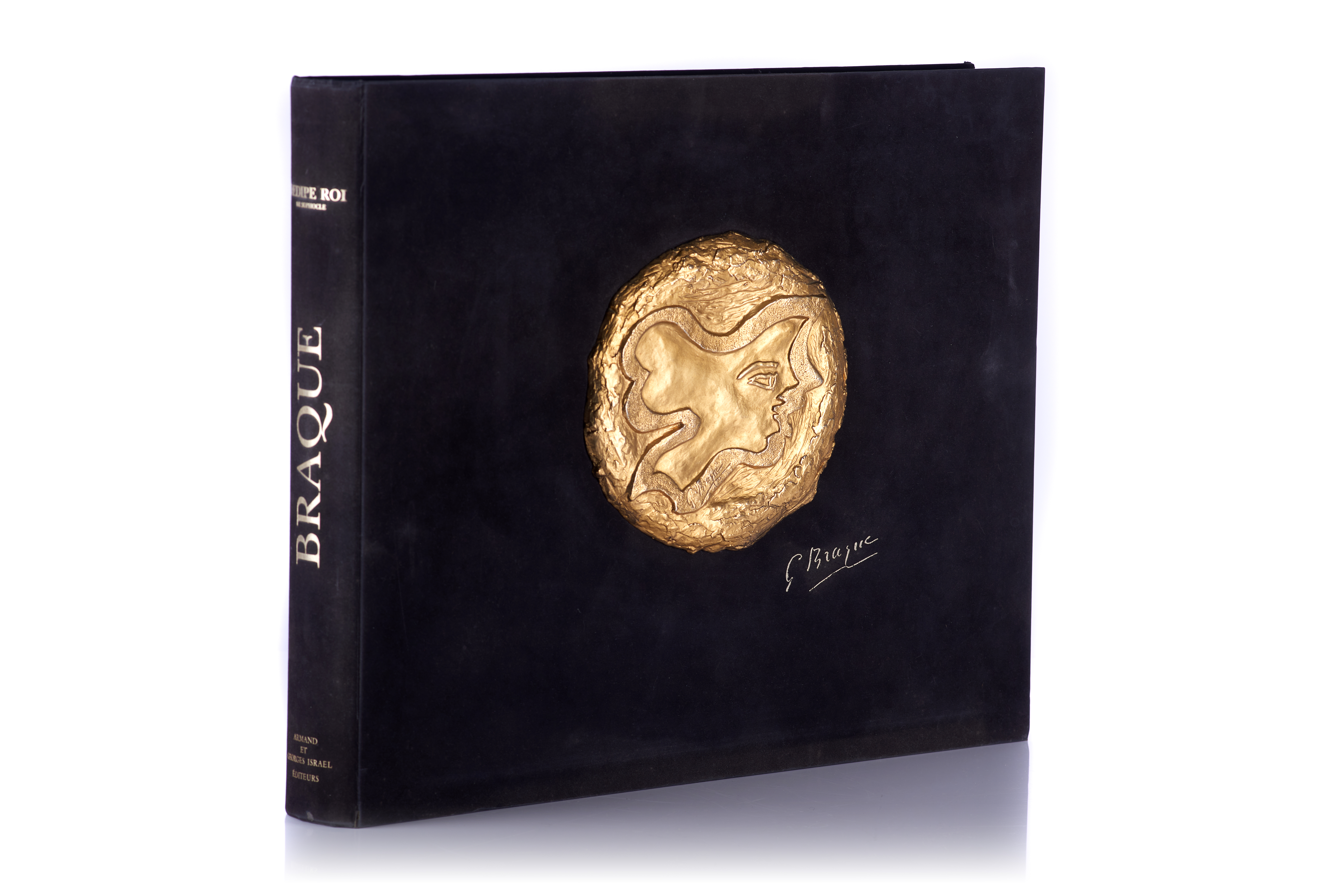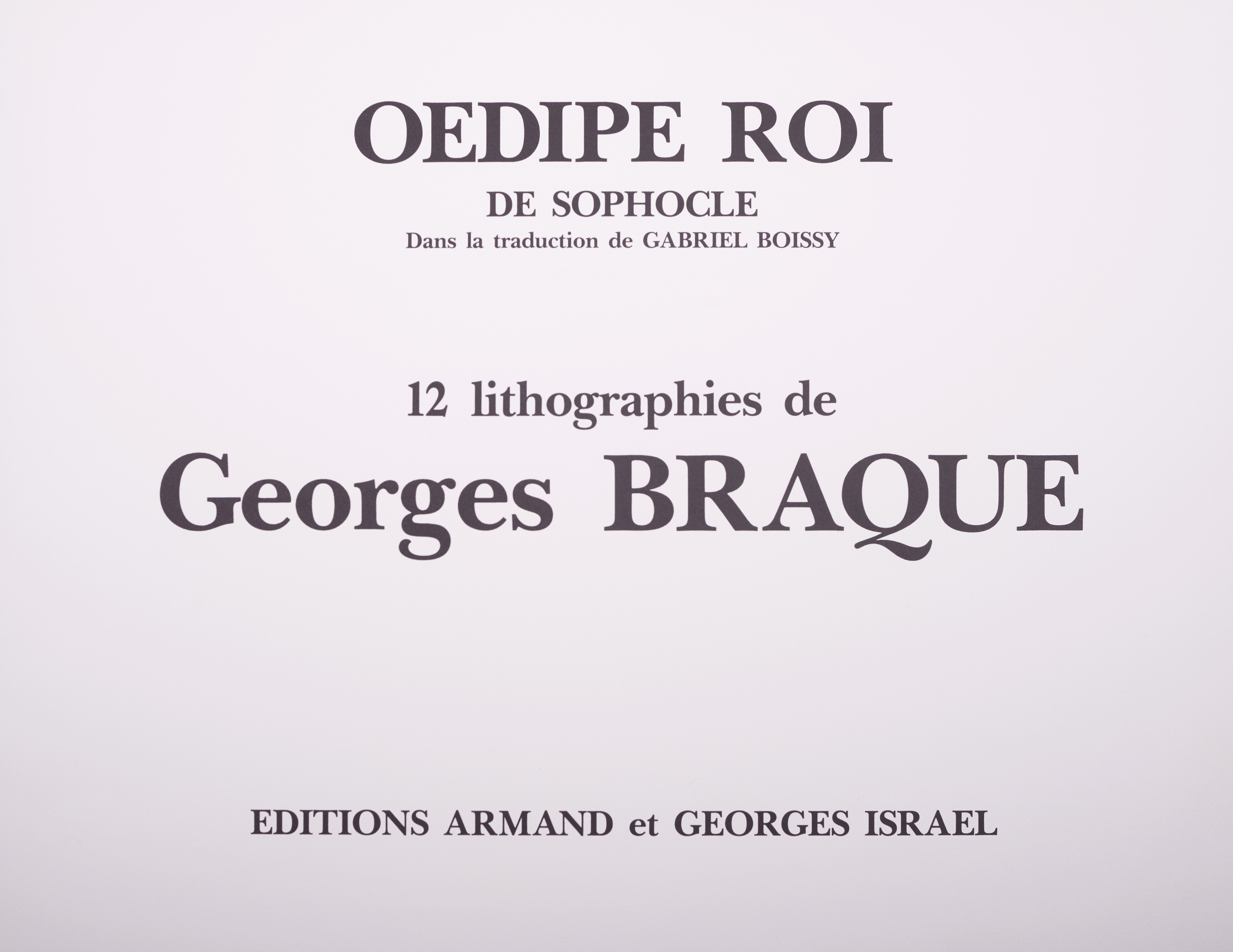 Hardcover folio comprising the text "Oedipe Roi" from Sophocles translated to french by Gabriel Boissy, illustrated with 12 lithographs (plus an extra one) from Georges Braques printed by atelier Art Litho on "grand vélin d'Arches pur chiffon" paper