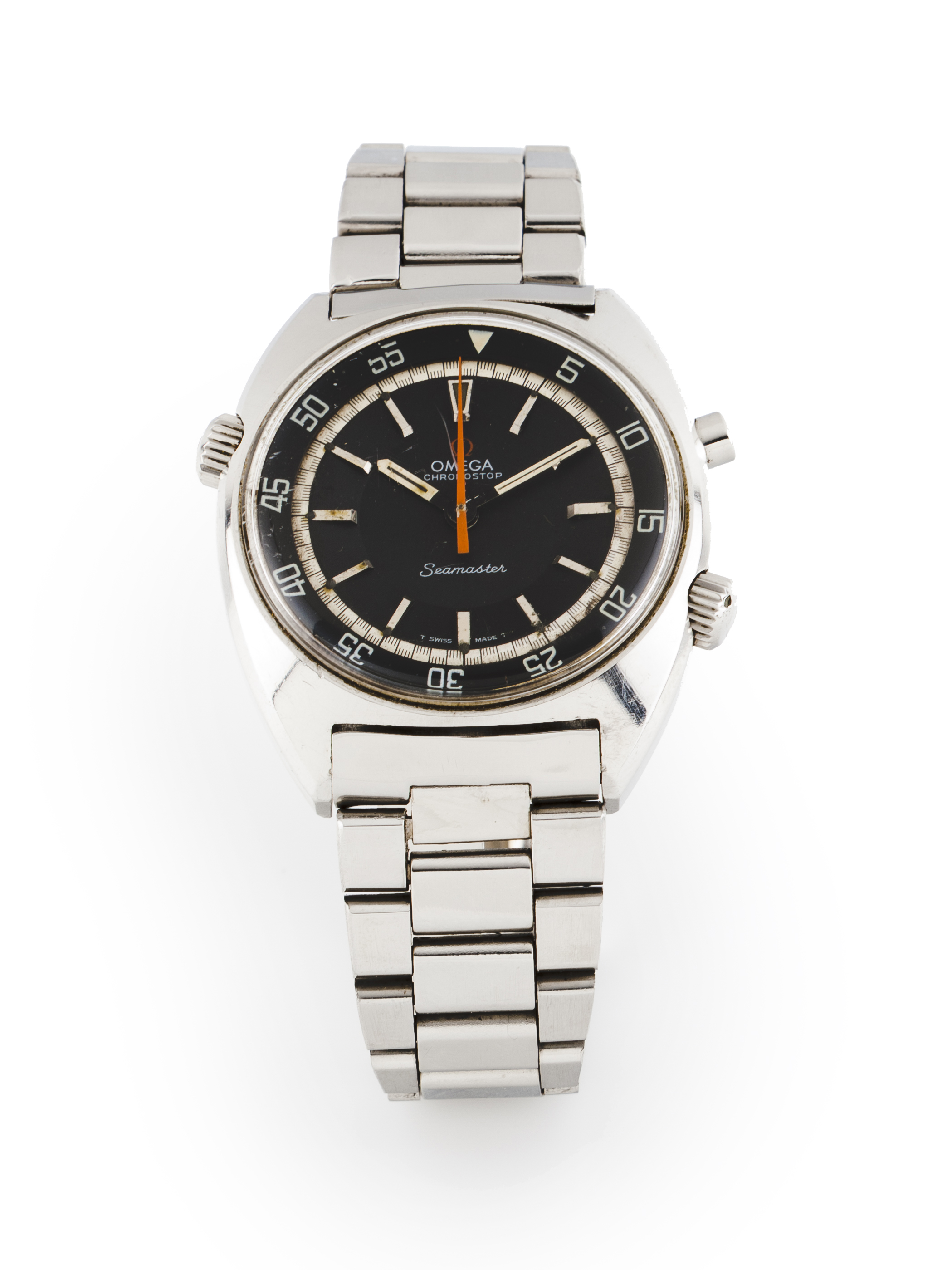 Seamaster Chronostop model. Winding mechanical movement (cal. 865) with stoptime function and serial Nº28091131. Stainless steel case and wristband with Ref. Nº 145.008. In good condition. With service case.