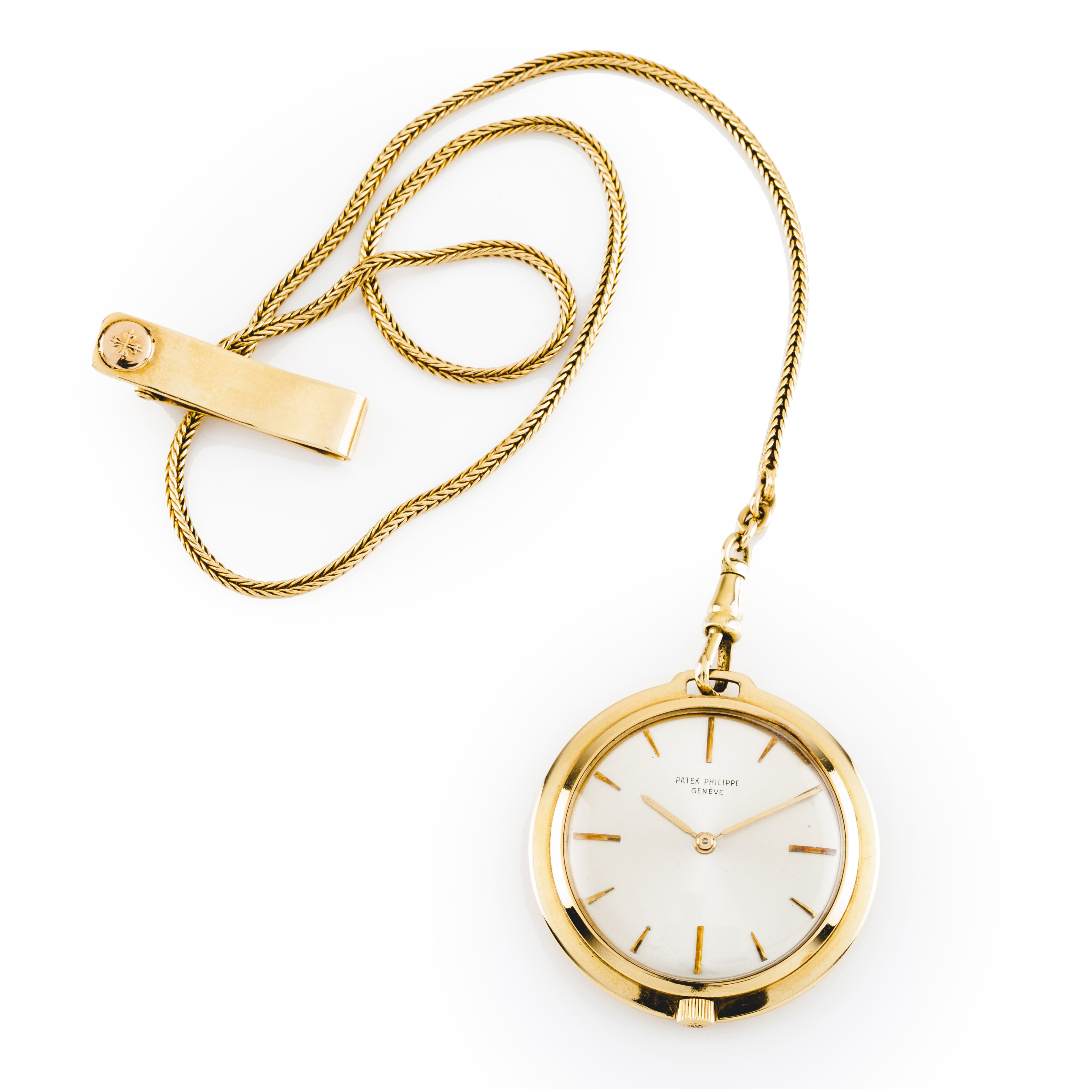 Patek Philippe Pocket Watch and pendant Set designed by Gilbert Albert with ref. No. 782. Manual winding mechanical movement (cal. 27-AM400) with Serial No. 733013. Gold case and chain (750/000). In very good condition.