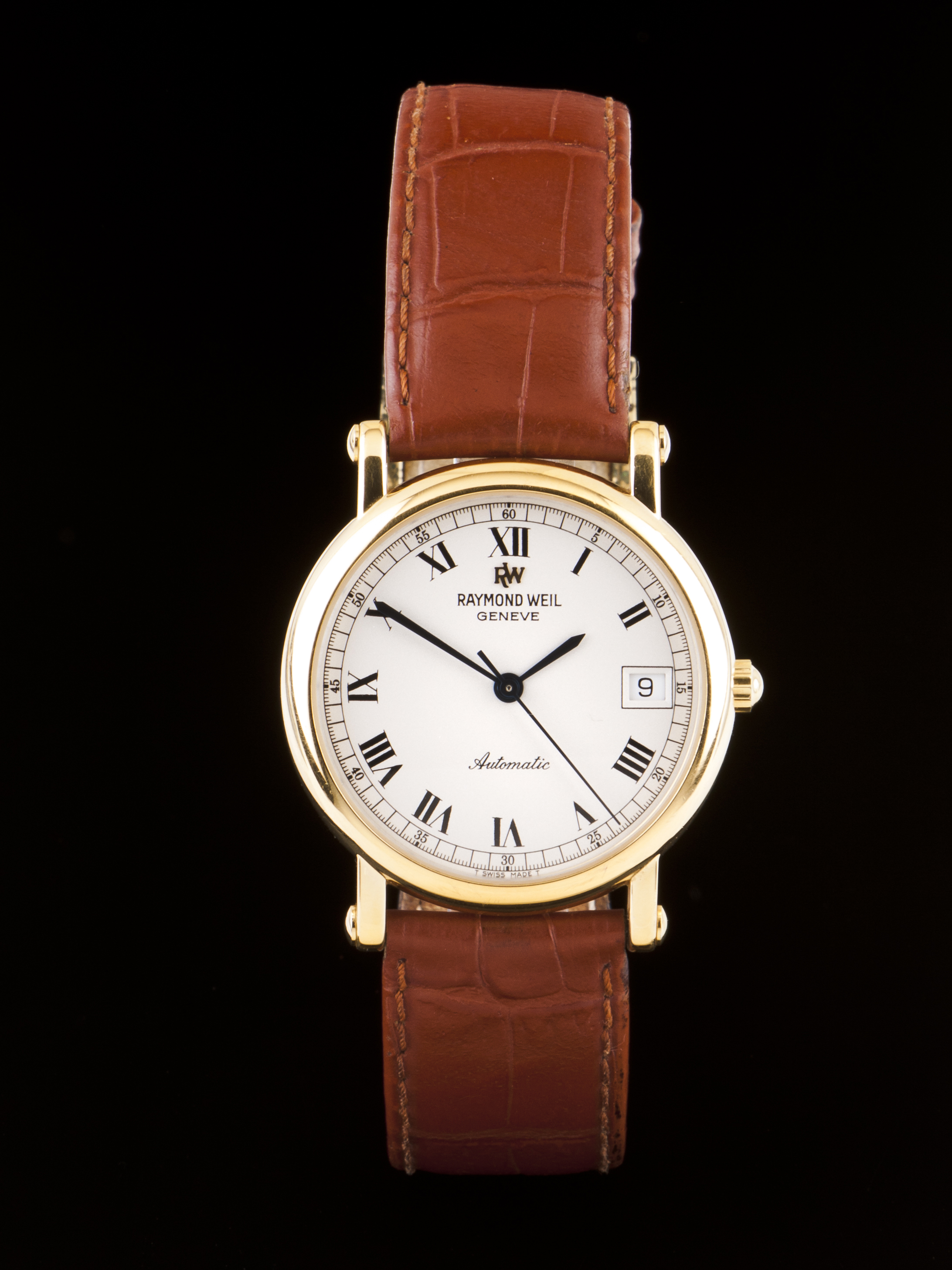 Raymond Weil watch, plated 33mm case. Mechanical automatic movement with date and seconds at the centre. With case and some documents. In good condition with wear signs