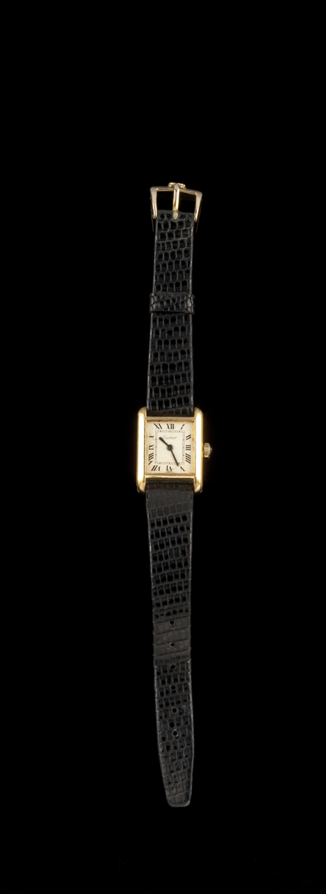 Caixa em plaqué ouro. Movimento mecânico de corda manual. Coroa com cabochão azul. Pulseira em lagarto negro.