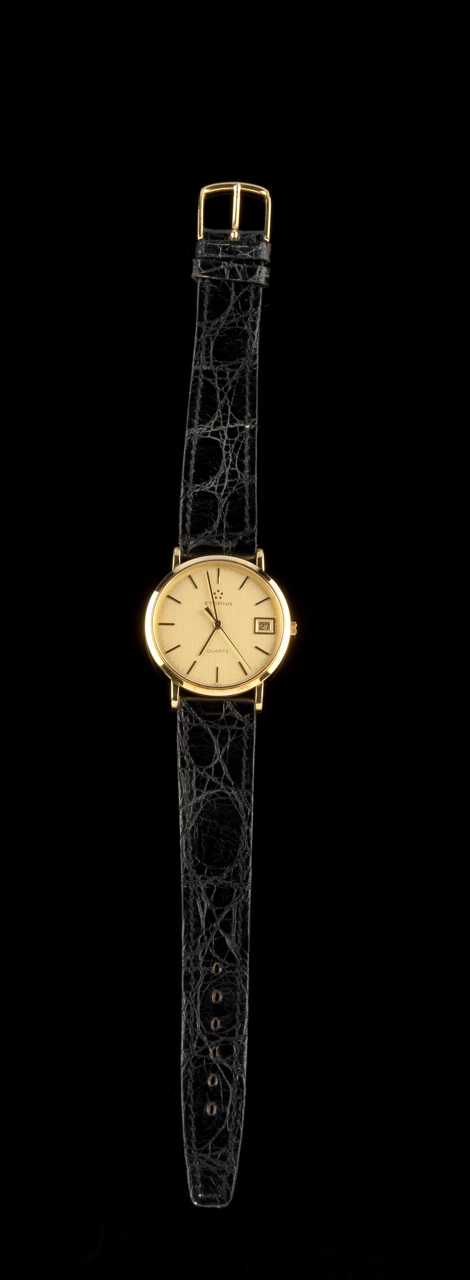 Caixa em ouro (18kt) com vidro de safira; pulseira em crocodilo preto. Movimento de quartzo, 6 rubis. Suíço, ca. 1980.