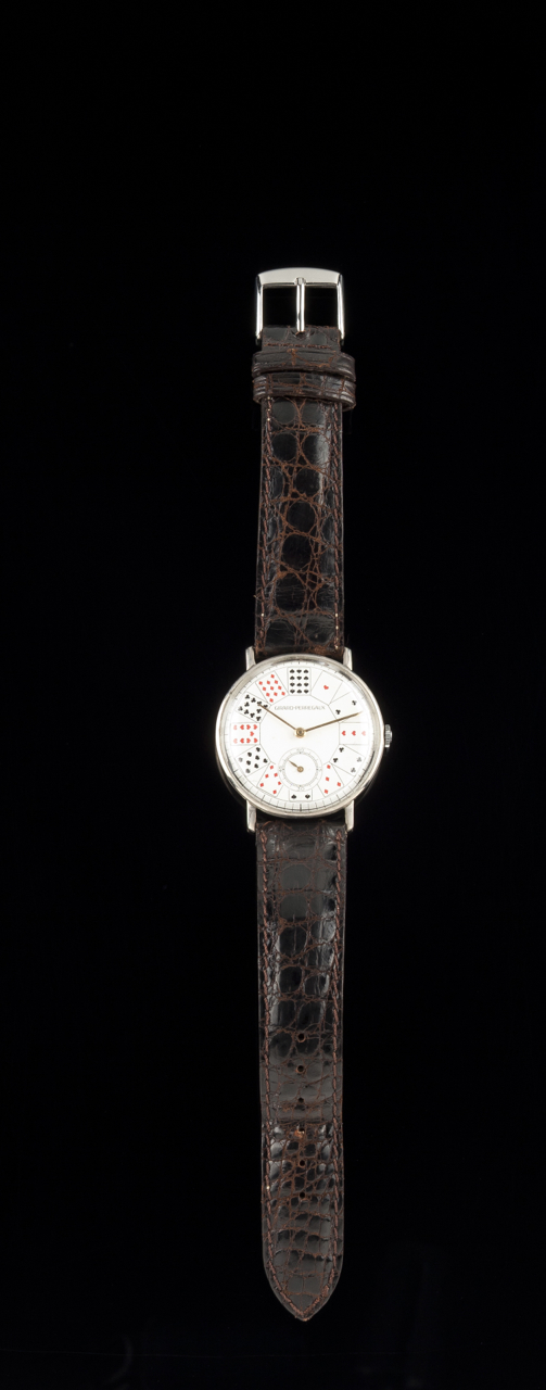 Modelo "Poker". Caixa em aço com ponteiros dourados e mostrador com "cartas de jogar". Movimento mecânico de corda manual.