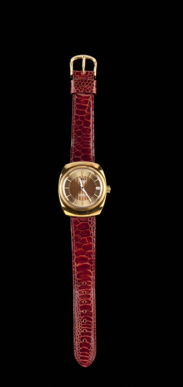 Caixa tonneau plaqué ouro com vidro sintético. Pulseira em pele. Movimento electrónico de diapasão. Suíço, ca. 1960.