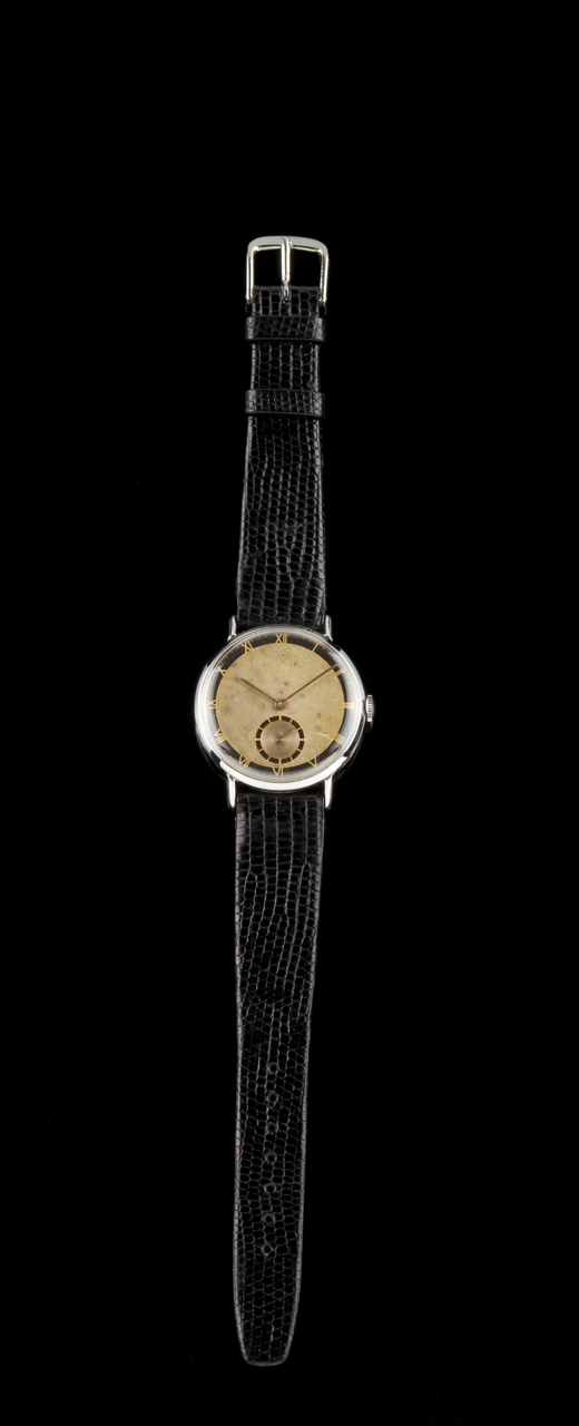 Caixa em metal cromado com vidro sintético. Pulseira em pele de lagarto negra. Movimento mecânico de corda manual. Suíça, ca. 1950. Nº8424230 na tampa.