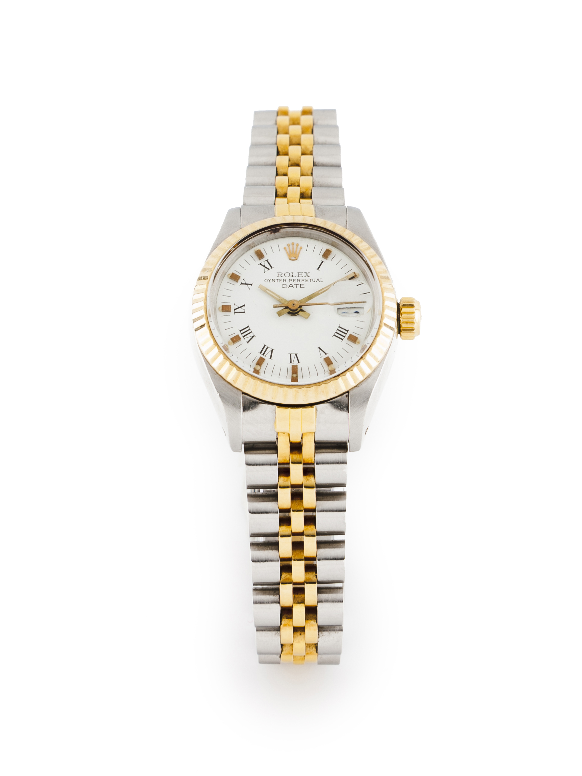 Oyster Perpetual date model with Ref. Nº . Automatic mechanical movement with date at 15h. Yellow gold and steel case and wristband. In good condition.