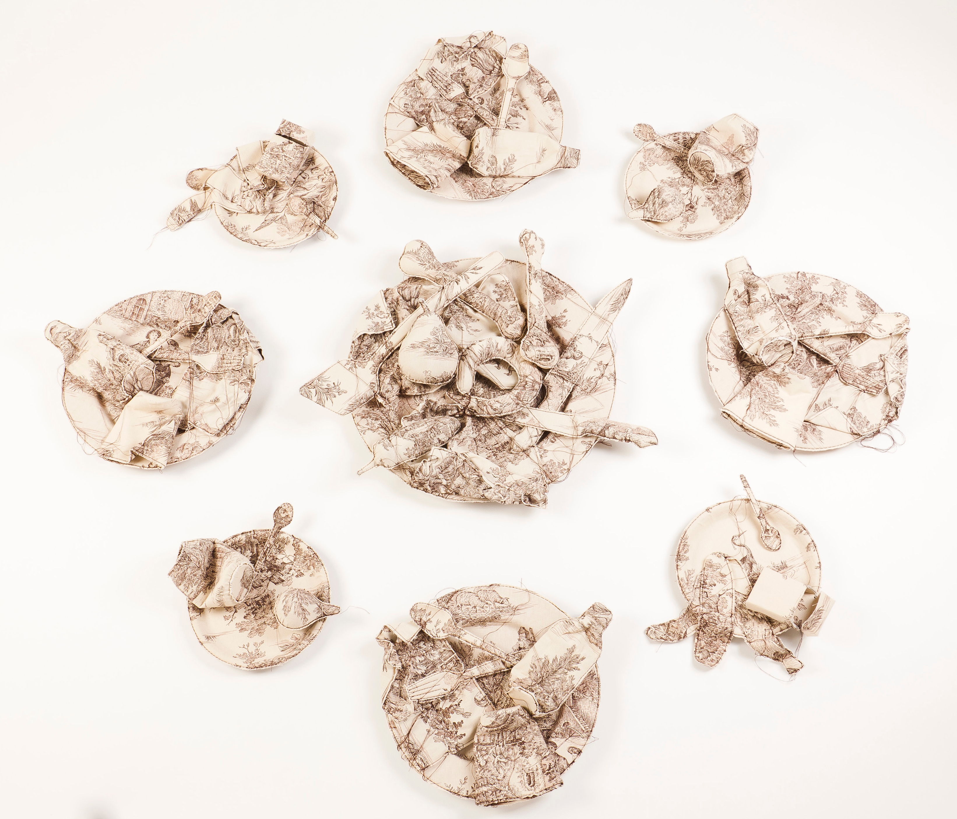 Toile de jouy fabric, plastic dishes, plastic cutlery, tobacco packets, decorative fruits, beer cans, aluminum foil, water bottles, dracalon and sewn thread