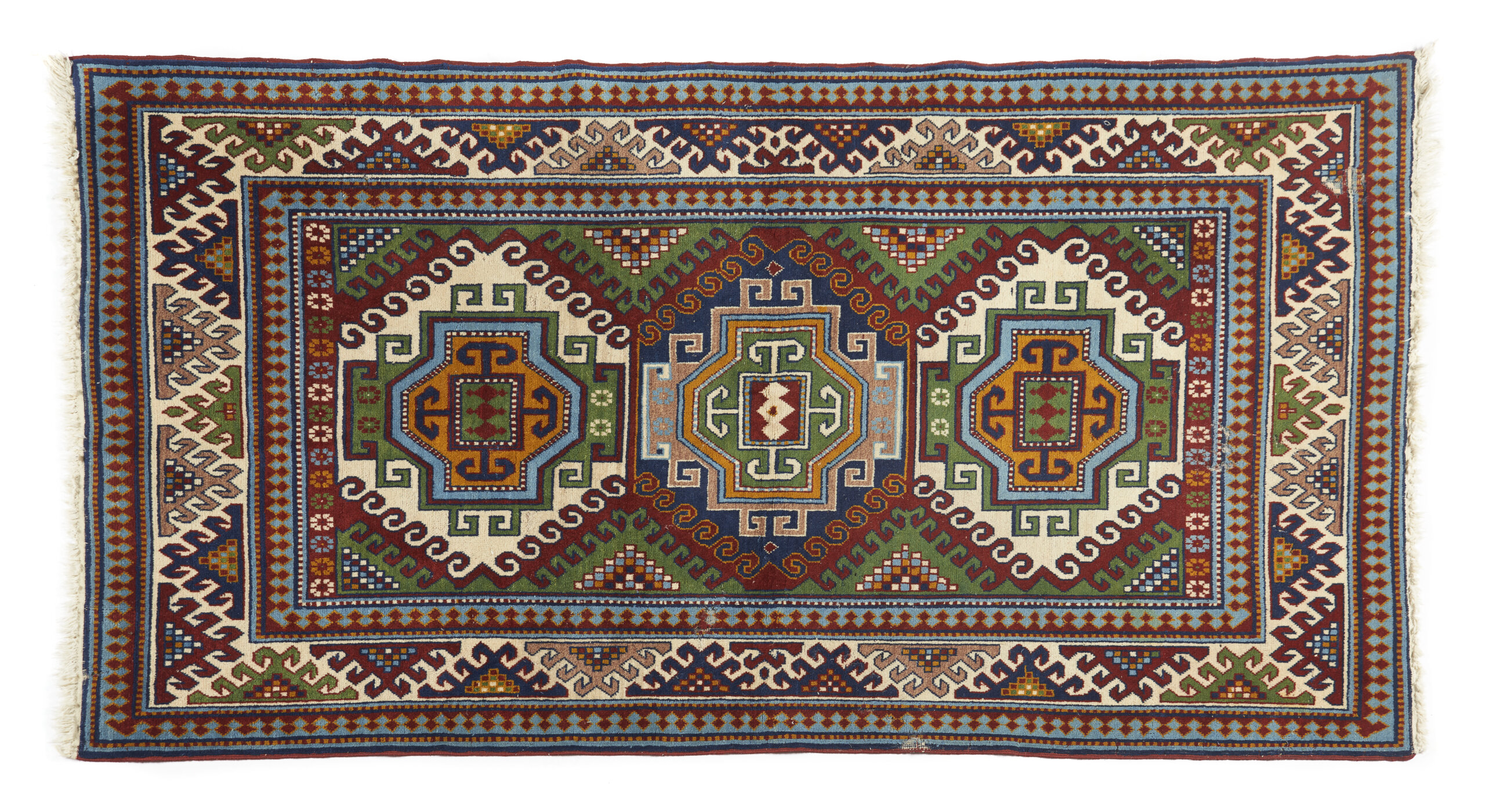 wool, featuring a geometric design in shades of green, white, yellow, blue, and burgundy